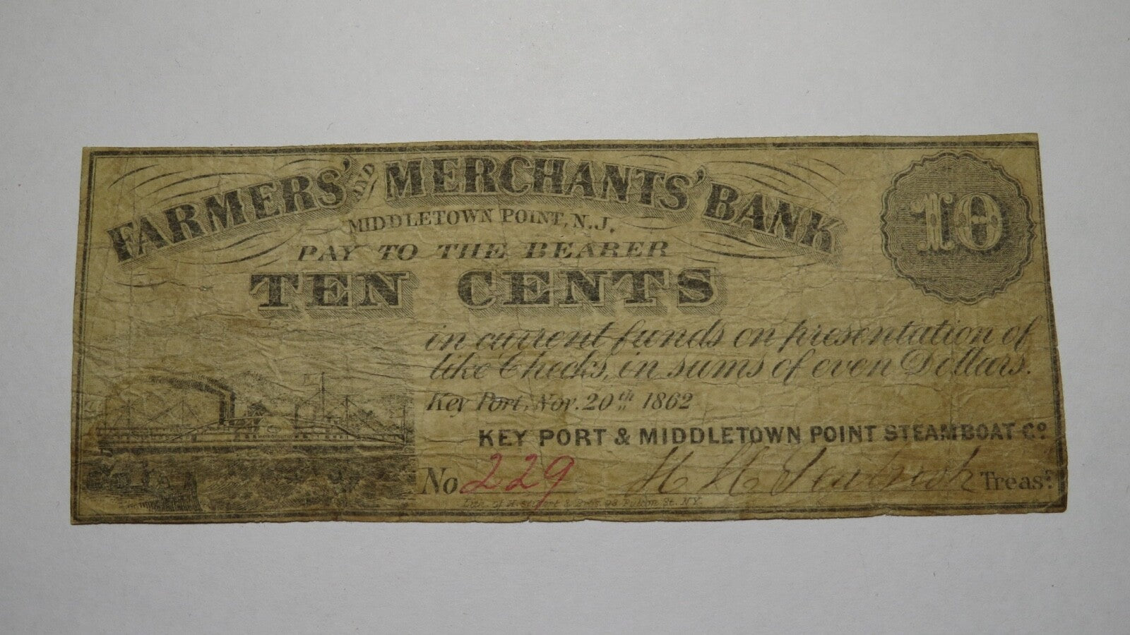 Up for auction is a $.10 1862 Middletown Point New Jersey Obsolete Bank Note. This note is dated November 20, 1862. This note was issued by The Keyport and Middletown Point Steamboat Company via The Farmers and Merchants Bank of Middletown Point. This note is extremely rare, and it is getting much harder to find this type of bill! This bill is a must have for any collector of Obsolete Currency!