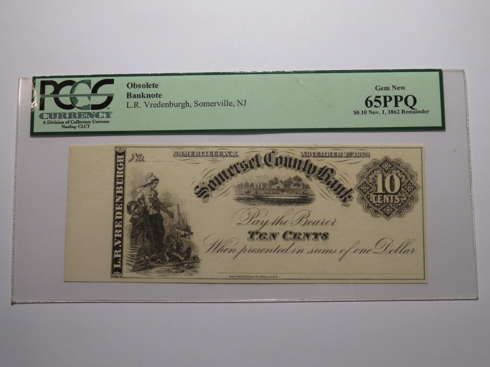 Up for auction is a $.10 1862 Somerville New Jersey Obsolete Bank Note. This note is dated November 1, 1862. This note was issued by The Somerset County Bank. This note has been graded Gem New 65PPQ by PCGS. This bill is a must have for any collector of Obsolete Currency!