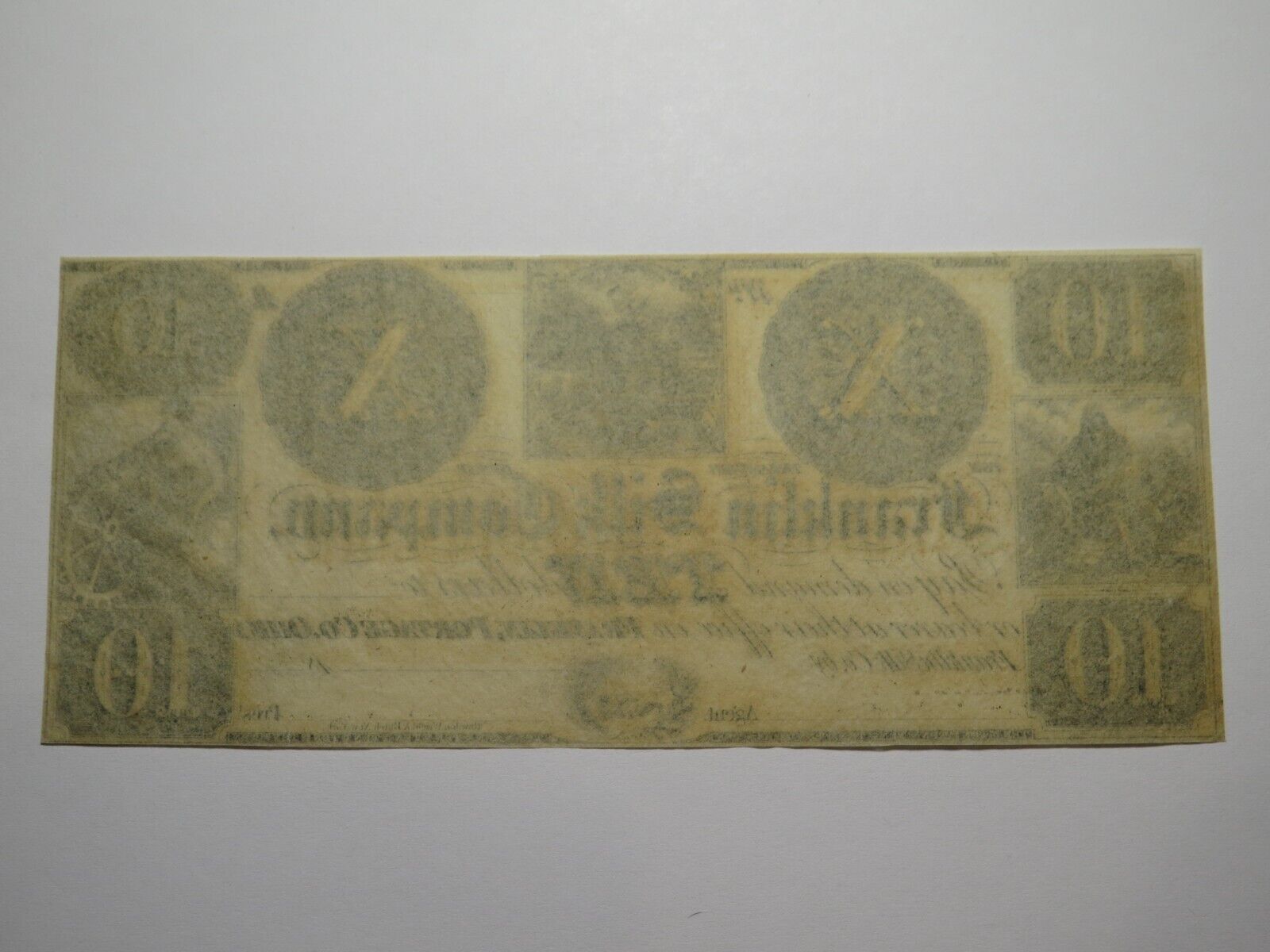 Up for auction is a $10 18__ Franklin Ohio Obsolete Currency Bank Note Remainder. This remainder would date roughly from the 1840-60's. This bill was issued from The Franklin Silk Company. This note is in Crisp Uncirculated condition. This bill is a must have for any collector of Obsolete Currency!