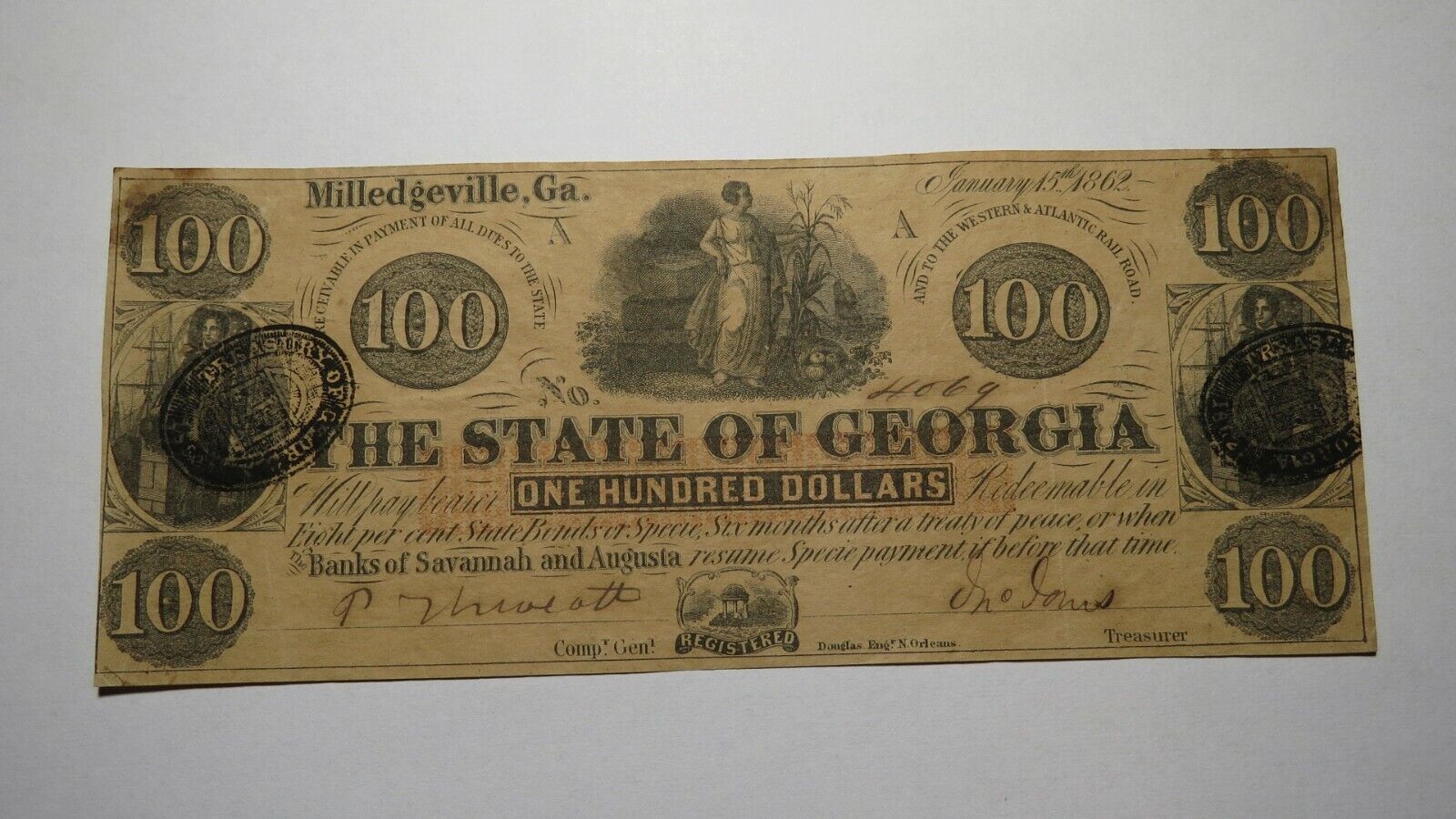 $100 1862 Milledgeville Georgia GA Obsolete Currency Bank Note Bill! State of GA