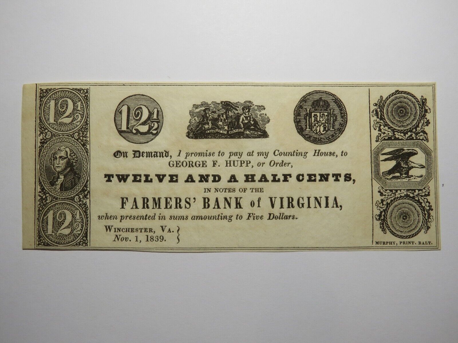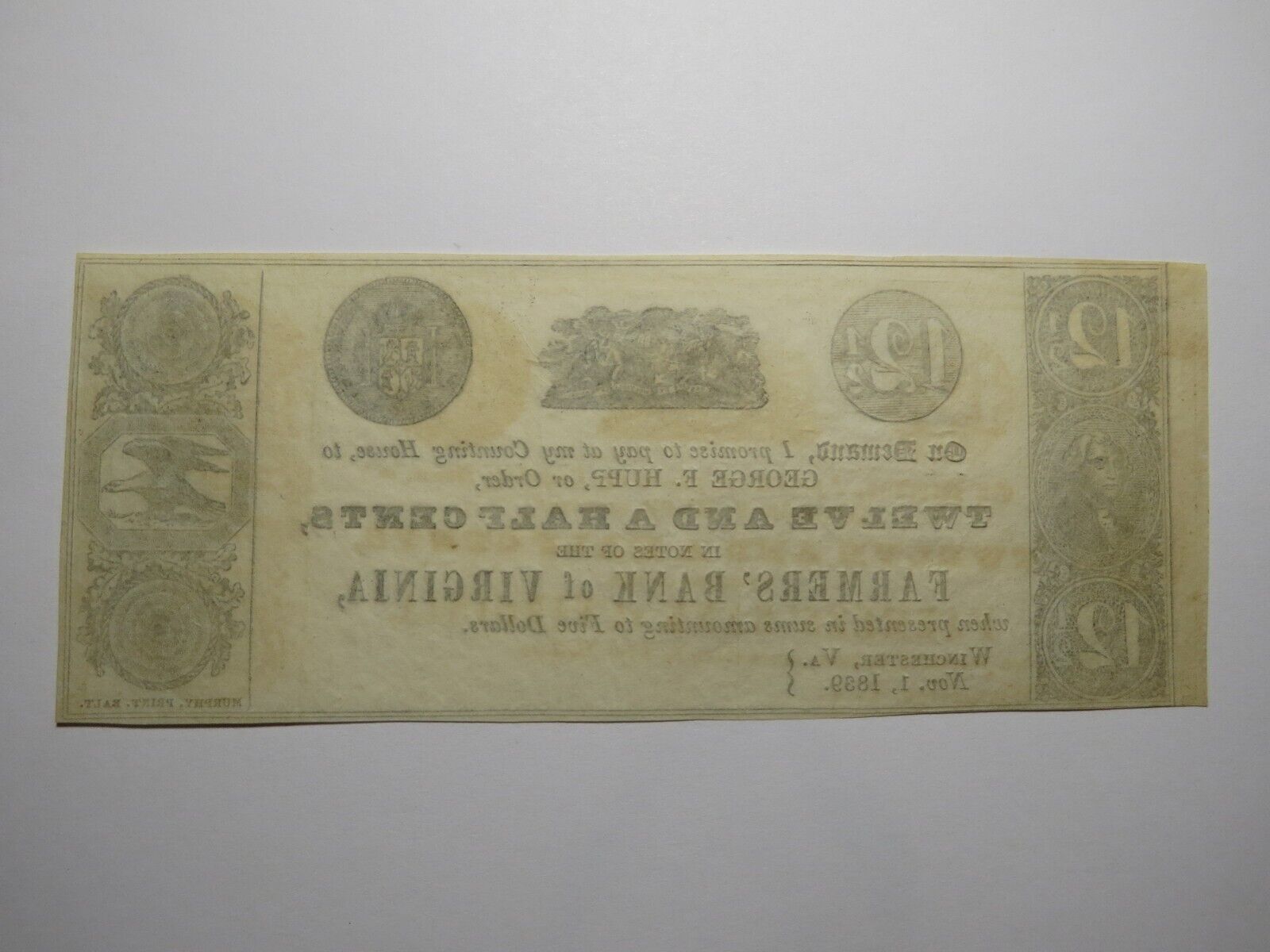 $.12 1/2 1839 Winchester Virginia Obsolete Bank Note!