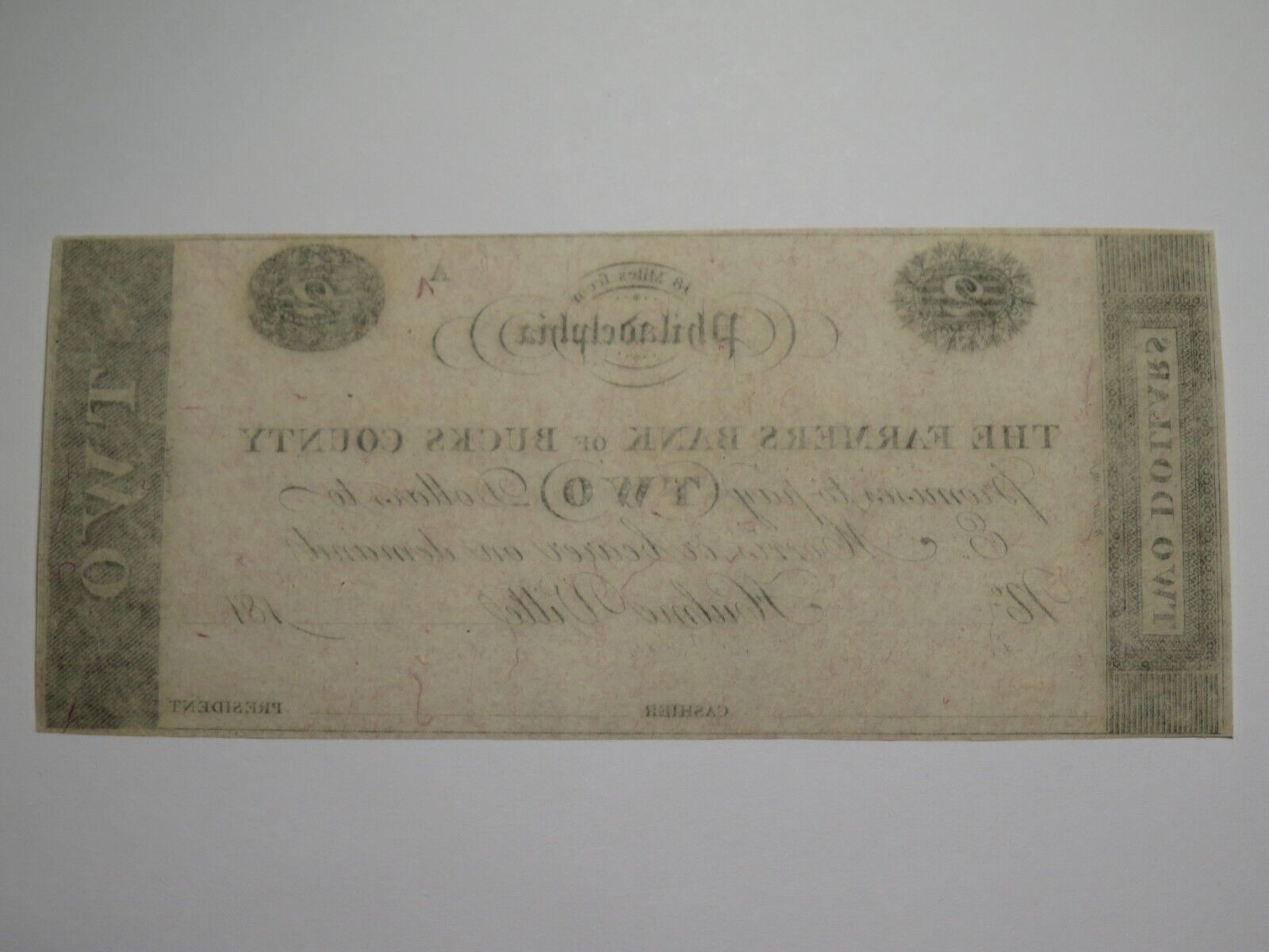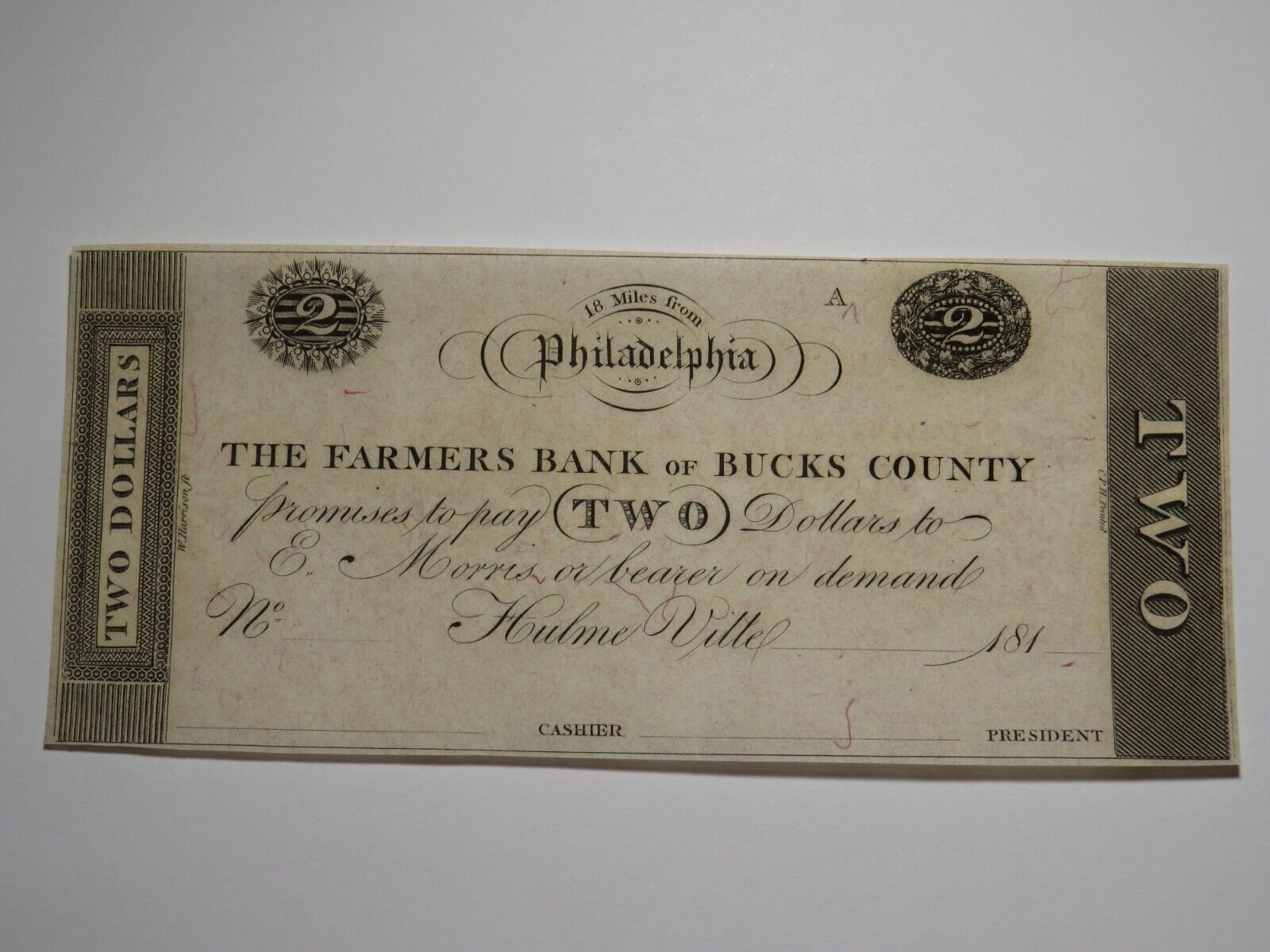 Up for auction is a $2 181_ Hulme Ville Pennsylvania Obsolete Remainder Bank Note