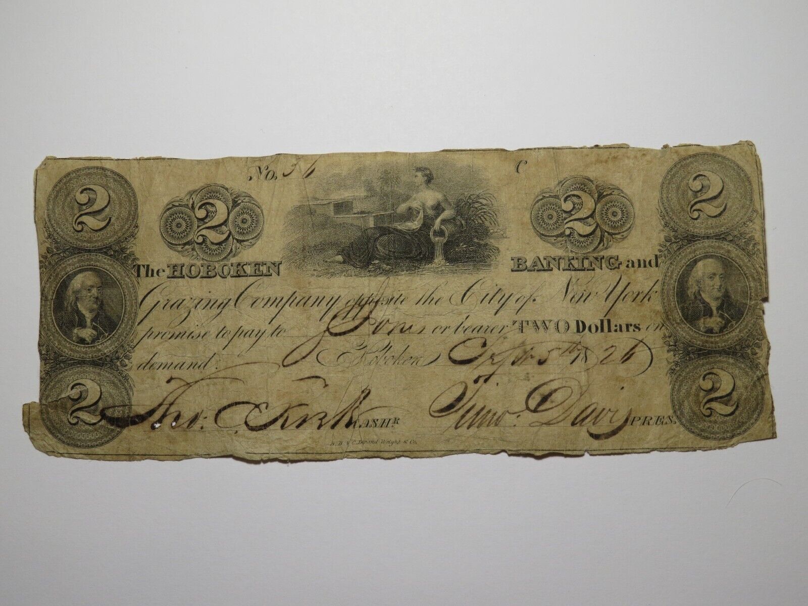 Up for auction is a $2 1826 Hoboken New Jersey Obsolete Bank Note. This note was issued by The Hoboken Banking and Grazing Company. This note is dated October 5, 1826. This is a tough to find issue! This bill is a must have for any collector of Obsolete Currency. If you have any questions please feel free to ask.