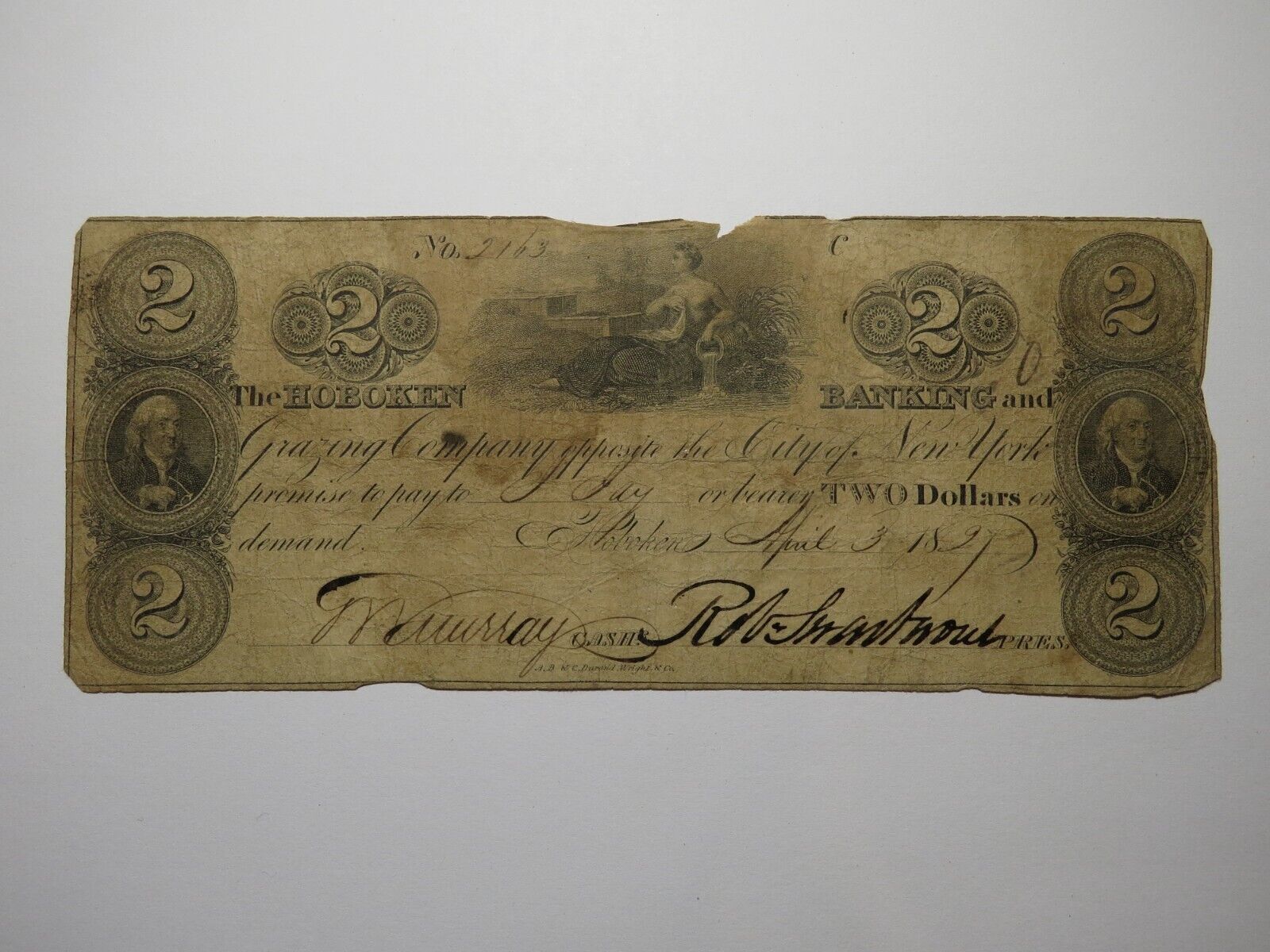 Up for auction is a $2 1827 Hoboken New Jersey Obsolete Bank Note. This note was issued by The Hoboken Banking and Grazing Company. This note is dated April 3, 1827. This is a tough to find issue! This bill is a must have for any collector of Obsolete Currency. If you have any questions please feel free to ask.