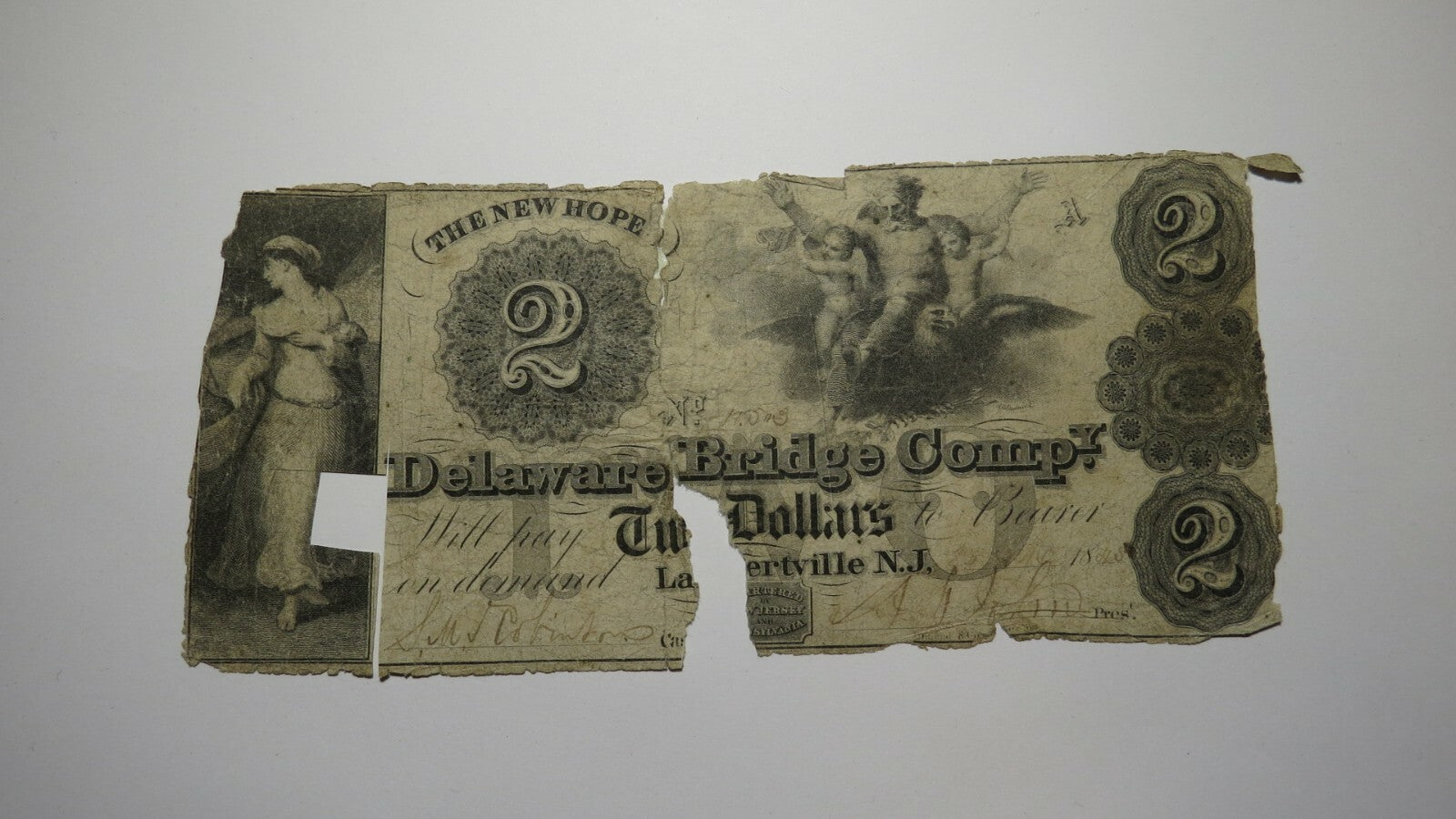 Up for auction is a $2 1845 Lambertville New Jersey Obsolete Bank Note. This note is dated July 20, 1845. This bill is issued from The Delaware Bridge Company. This bill has some obvious issues with its condition, but the scarcity of this town makes up for it. This is a great bill from a tough to find town! This bill is a must have for any collector of Obsolete Currency!