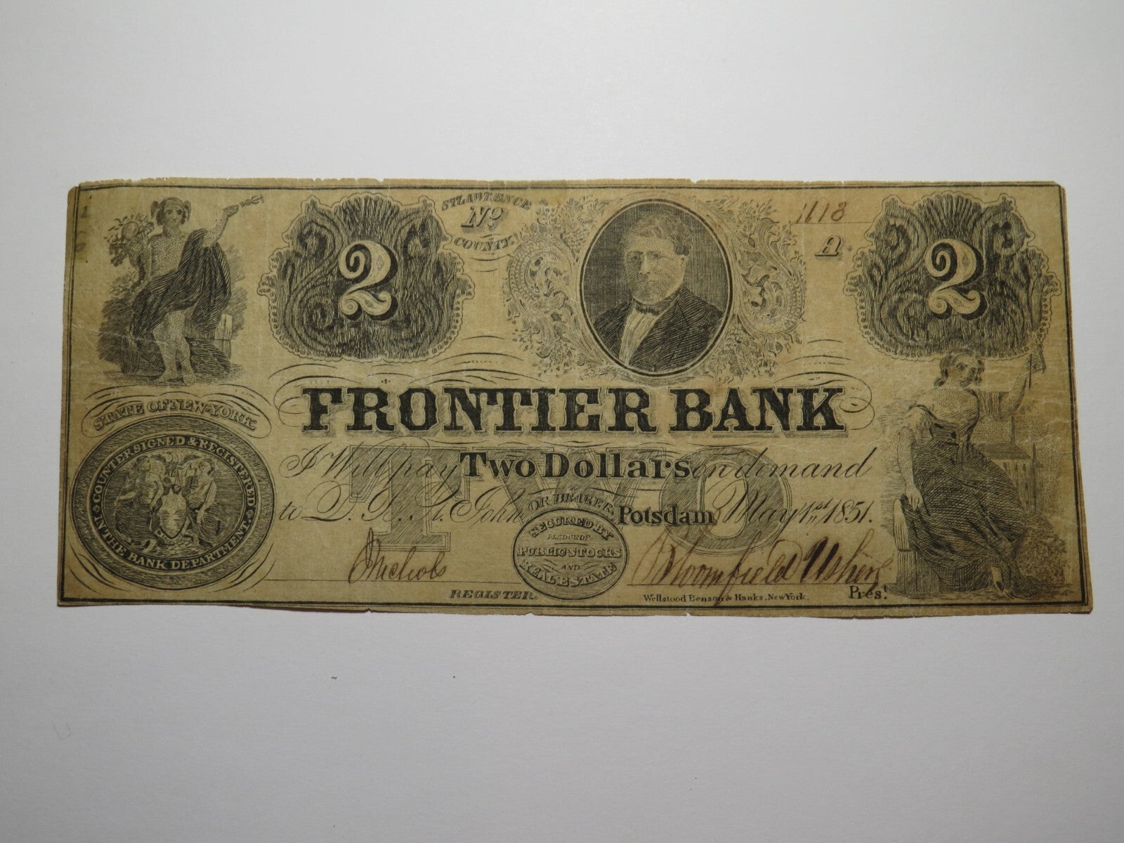 Up for auction is a $2 1851 Potsdam New York Obsolete Bank Note. This note is dated May 1, 1851. This bill was issued by The Frontier Bank. This note is a contemporary counterfeit. This is an extremely rare issue. This bill is a must have for any collector of Obsolete Currency!