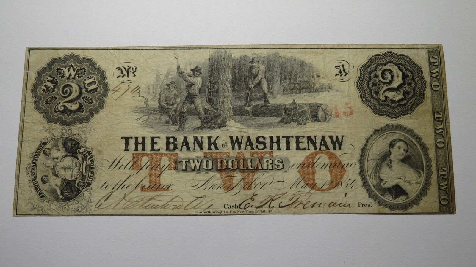 Up for auction is a $2 1854 Ann Arbor Michigan Obsolete Bank Note. This note is dated May 1, 1854. This note was issued by The Bank of Washtenaw. This bill is a must have for any collector of Obsolete Currency!