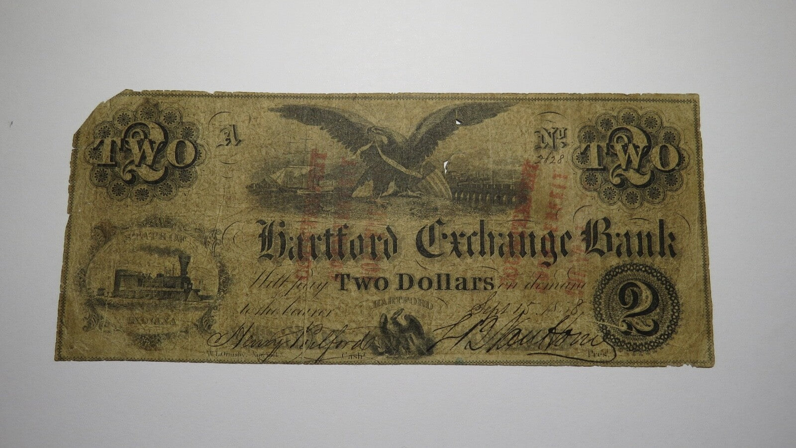 Up for auction is a $2 1858 Hartford Indiana Obsolete Bank Note. This note is issued from The Hartford Exchange Bank. This note is dated September 15, 1858. This note is stamped "counterfeit", but it actually is not a counterfeit. This bill is a must have for any collector of Obsolete Currency!