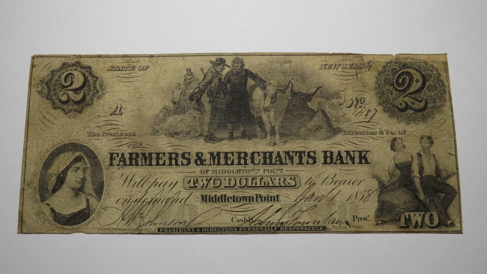 Up for auction is a $2 1858 Middletown Point New Jersey Obsolete Bank Note. This note is dated January 1, 1858. This bill is issued from The Farmers & Merchants Bank of Middletown Point. This is a great bill from a tough to find town! This bill is a must have for any collector of Obsolete Currency!