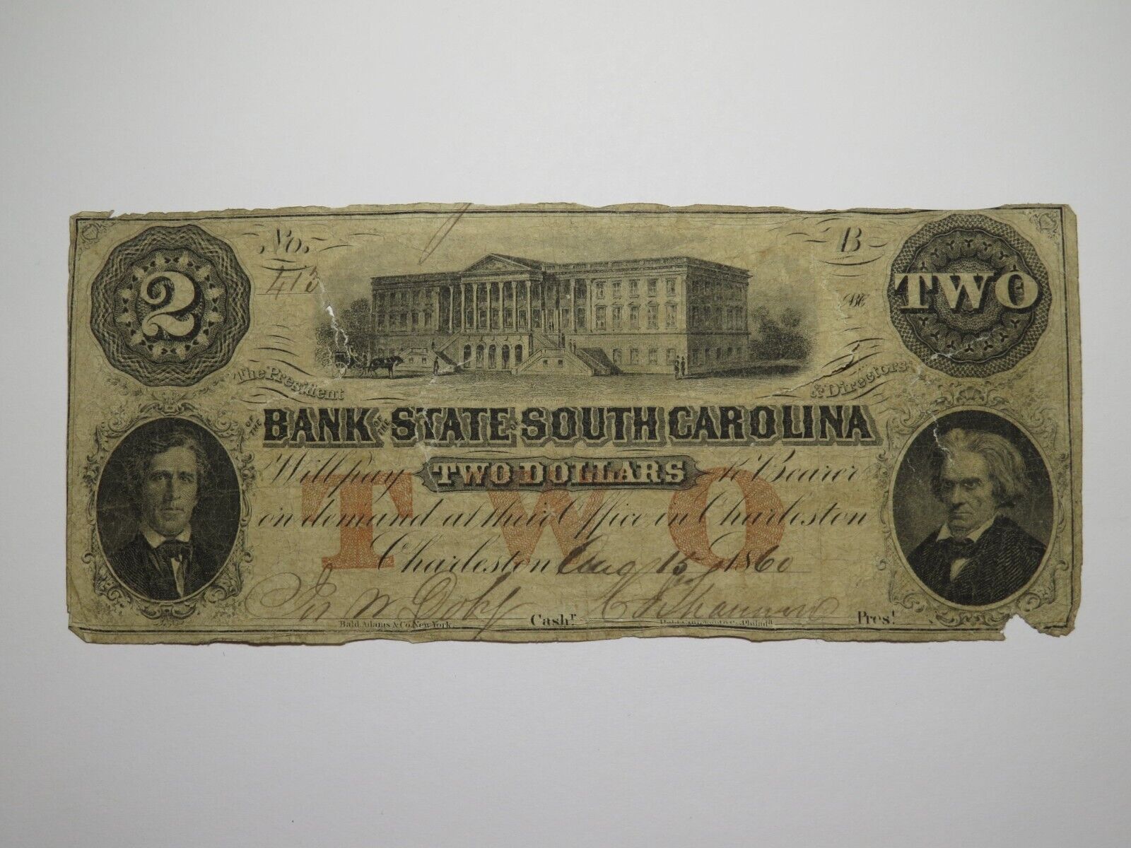 Up for auction is a $2 1860 Charleston South Carolina Obsolete Currency Note. This note is dated August 15, 1860. This note was issued by The Bank of the State of South Carolina. This is a tough to find issue! This bill is a must have for any collector of Obsolete Currency!
