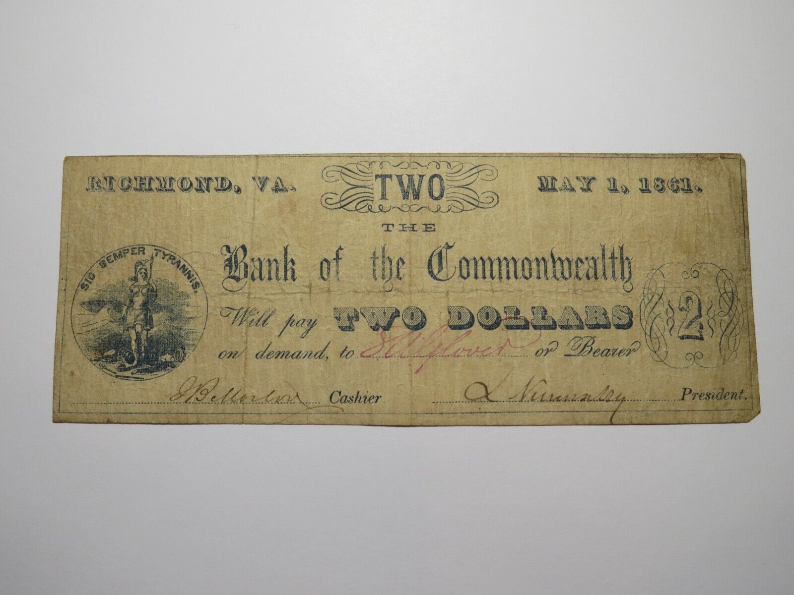 Up for auction is a $2 1861 Richmond Virginia Obsolete Currency Note.  It was issued from The Bank of the Commonwealth of Virginia.  This note is dated May 1, 1861.  This is a tough to find issue.  This bill is a must have for any collector of Obsolete Currency!