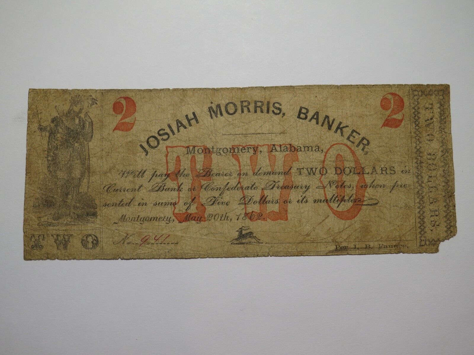 Up for auction is a $2 1862 Montgomery Alabama Obsolete Bank Note. This note is dated May 20, 1862. This note was issued by Josiah Morris, Banker in Montgomery. This bill is a must have for any collector of Obsolete Currency. If you have any questions please feel free to ask!