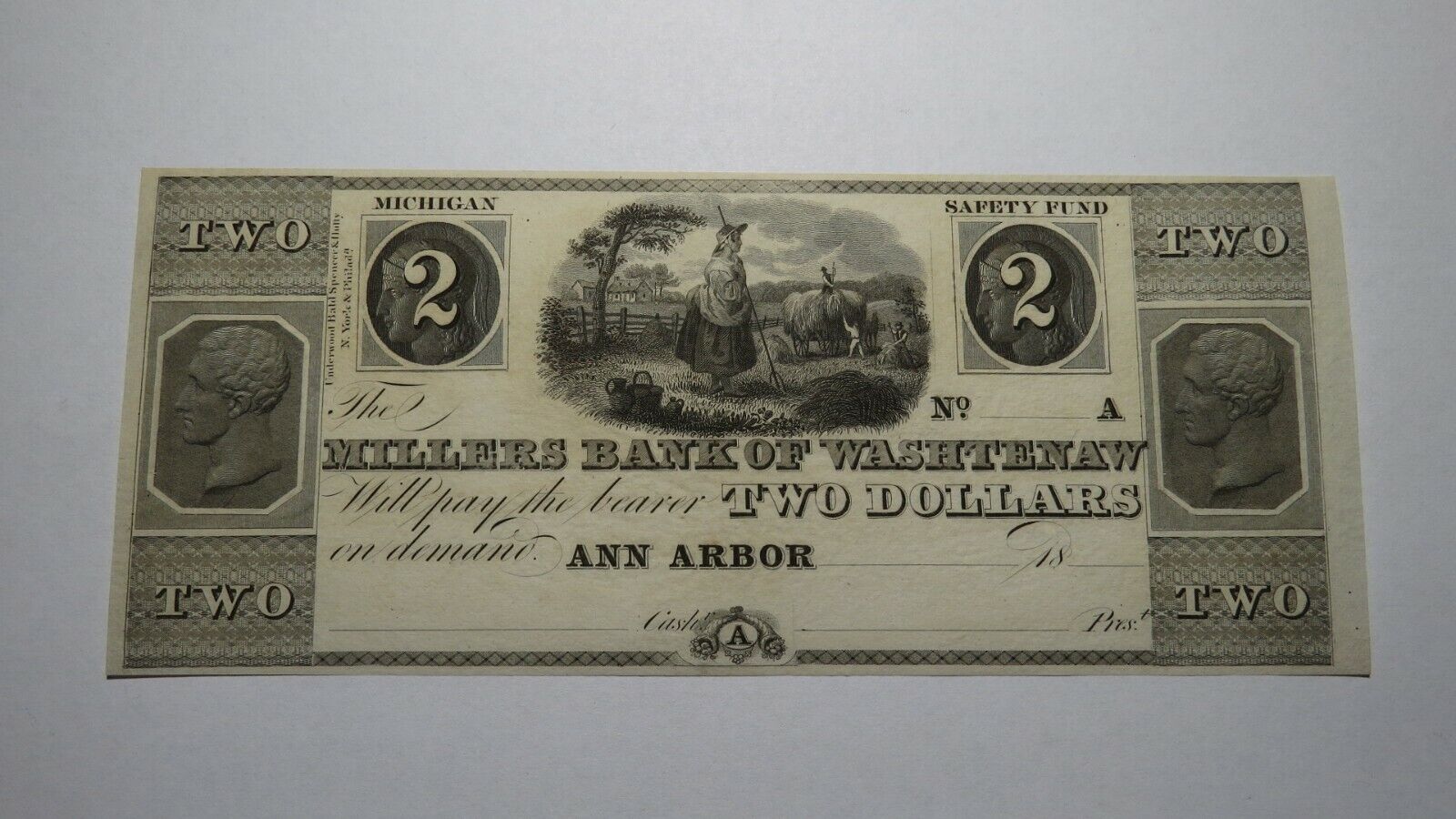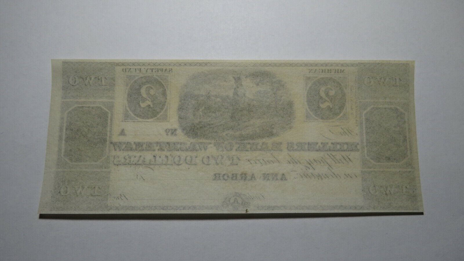 Up for auction is a $2 18__ Ann Arbor Michigan Obsolete Bank Note Remainder. This note dates from the 1830's. It is issued from The Miller's Bank of Washtenaw. This note is in Crisp Uncirculated condition! This bill is a must have for any collector of Obsolete Currency!