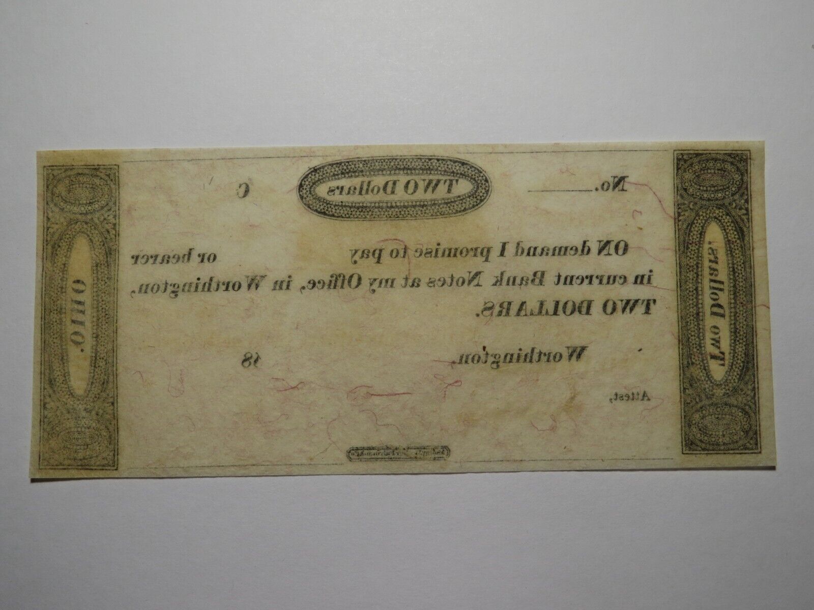 Up for auction is a $2 18__ Worthington Ohio Obsolete Remainder Bank Note. This note was issued by The Office of Erza Griswold. This note is in Crisp Uncirculated condition. This note is extremely rare, and it is getting much harder to find this type of bill! This bill is a must have for any collector of Obsolete Currency!