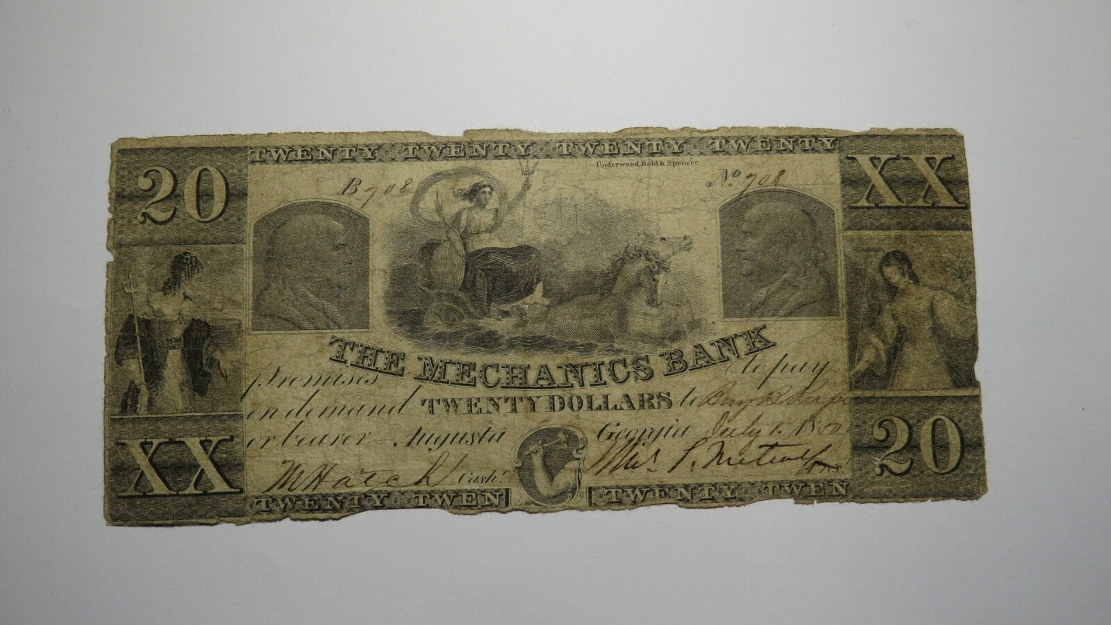 Up for auction is a $20 1850 Augusta Georgia Obsolete Bank Note. This note is dated July 1, 1850. This bill is issued from the Mechanics Bank of Augusta. This is a great rare bill from a very popular Georgia city! This bill is a must have for any collector of Obsolete Currency!