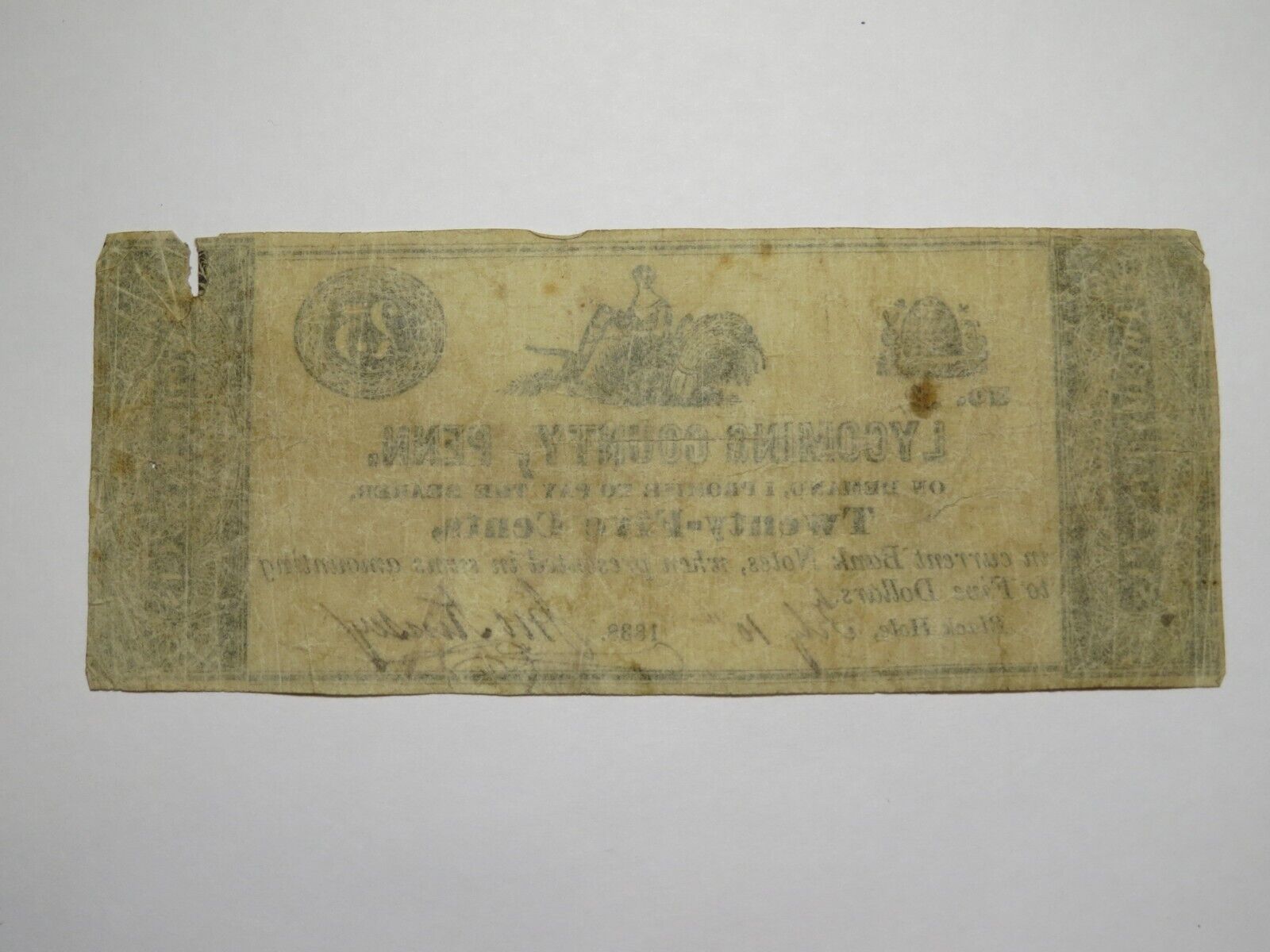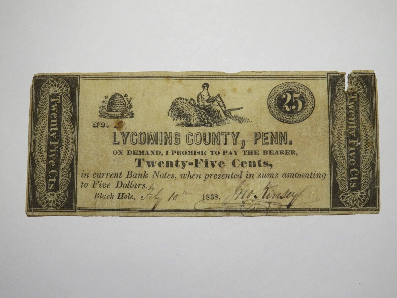 Up for auction is a $.25 1838 Black Hole Pennsylvania Obsolete Bank Note