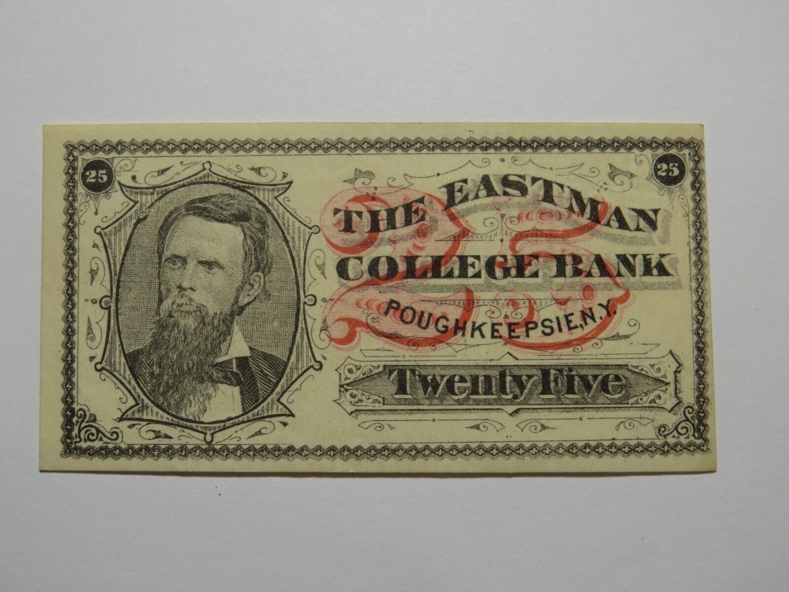 Up for auction is a $.25 1870's Poughkeepsie New York Obsolete Currency Note. This note dates from the 1870's. This note was issued by The Eastman Business College Bank. This is a tough to find issue. This bill is a must have for any collector of Obsolete Currency. If you have any questions please feel free to ask!