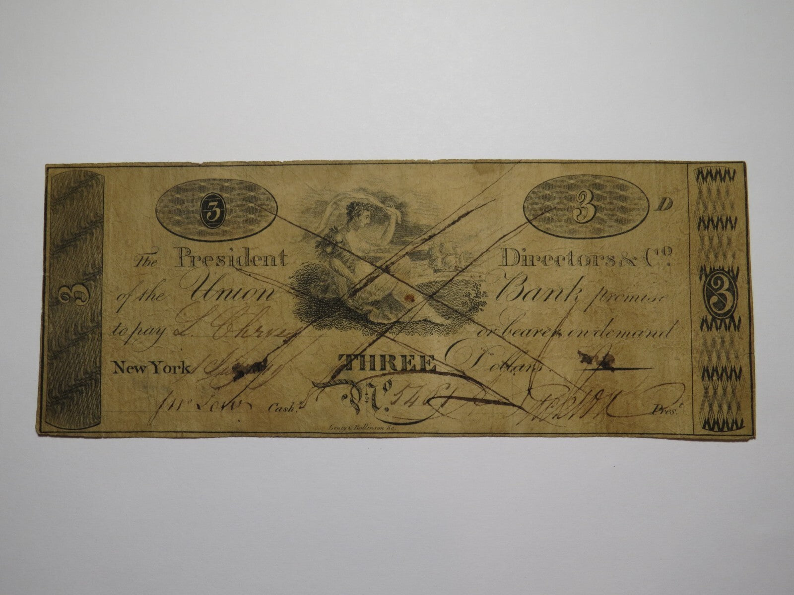 Up for auction is a $3 1819 New York Obsolete Bank Note. This note is dated July 1, 1819. This note was issued by The Union Bank. This is a contemporary counterfeit. This bill is a must have for any collector of Obsolete Currency. If you have any questions please feel free to ask.