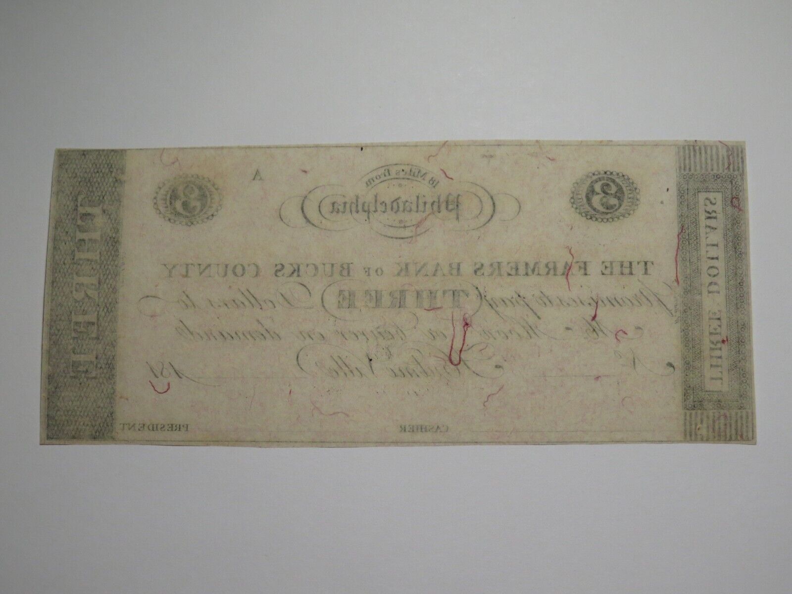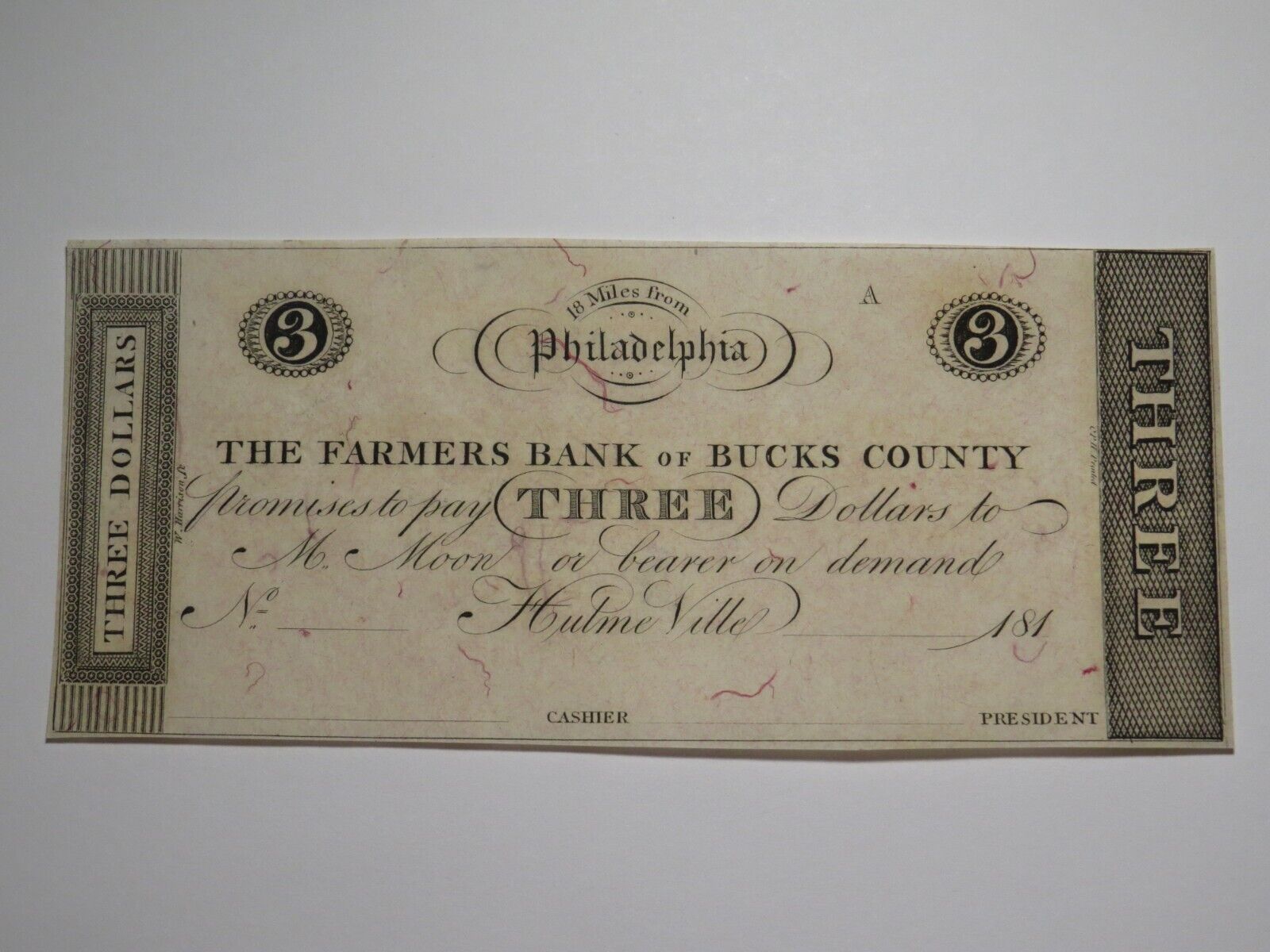 Up for auction is a $3 181_ Hulme Ville Pennsylvania Obsolete Remainder Bank Note
