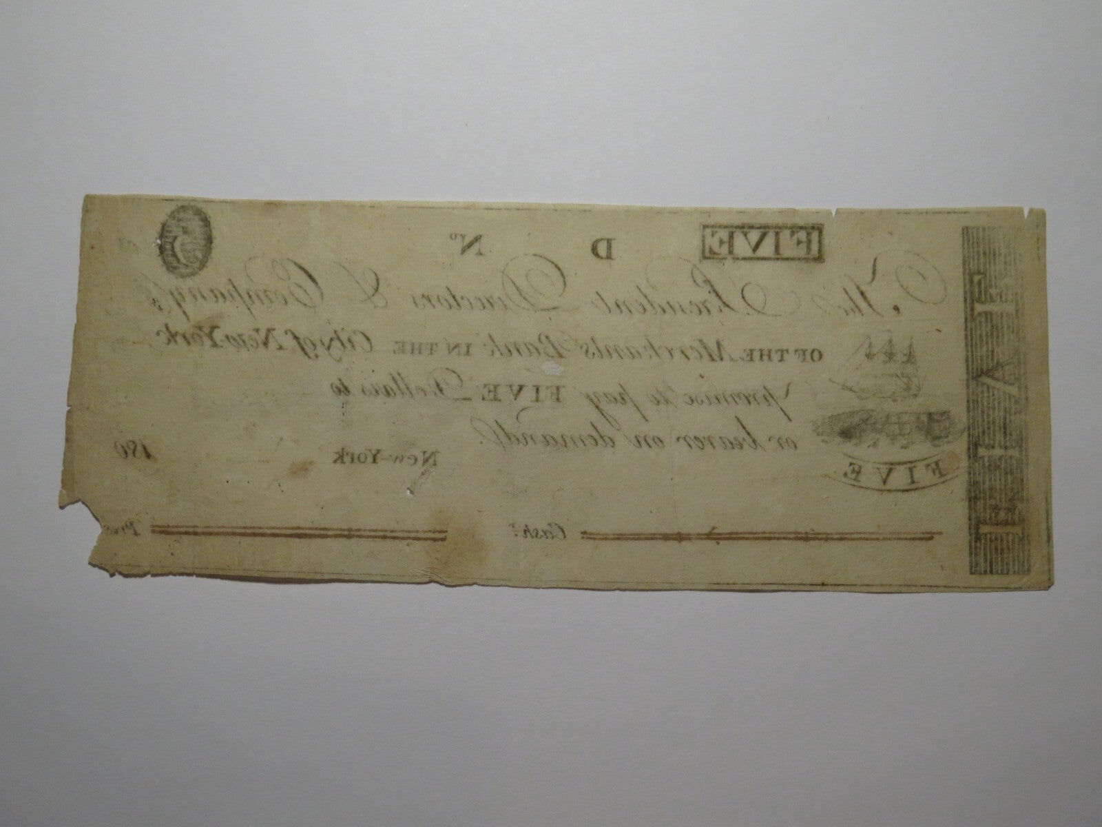 Up for auction is a $5 180_ New York City Obsolete Bank Note. This note was issued by The Merchants' Bank in the City of New York. This note dates from the first decade in the 1800's. This is a contemporary counterfeit remainder. This bill is a must have for any collector of Obsolete Currency. If you have any questions please feel free to ask!
