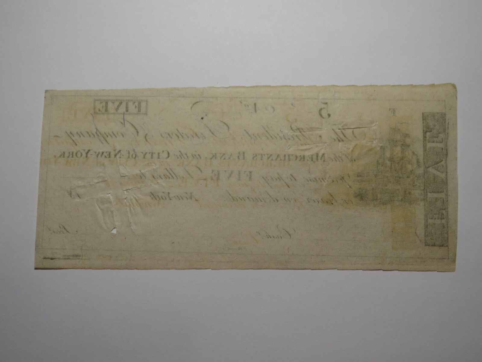 Up for auction is a $5 180_ New York City Obsolete Bank Note. This note was issued by The Merchants' Bank in the City of New York. This note dates from the first decade in the 1800's. This note has been hammer cancelled. This bill is a must have for any collector of Obsolete Currency. If you have any questions please feel free to ask!