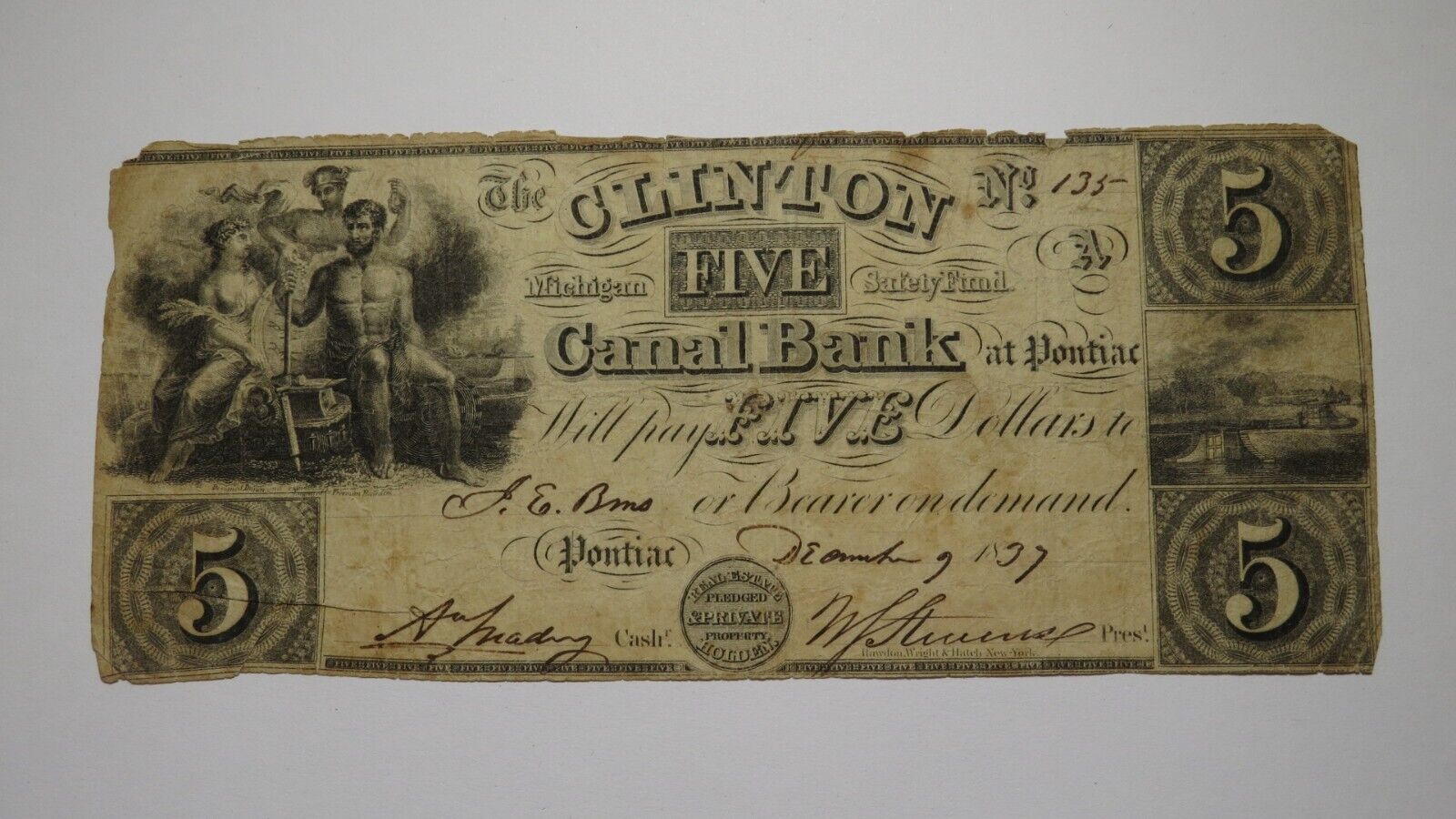 $5 1837 Pontiac Michigan Obsolete Bank Note!
