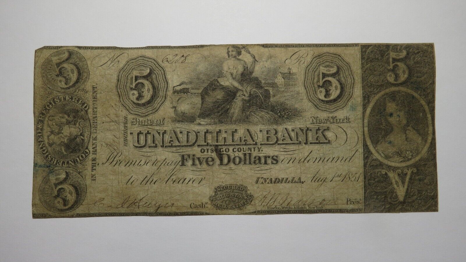 Up for auction is a $5 1851 Unadilla New York Obsolete Bank Note. This note was "issued" by The Unadilla Bank. This note is dated August 1, 1851. This note is a contemporary counterfeit (this note was counterfeited in the 1850-1860's). This bill is a must have for any collector of Obsolete Currency!