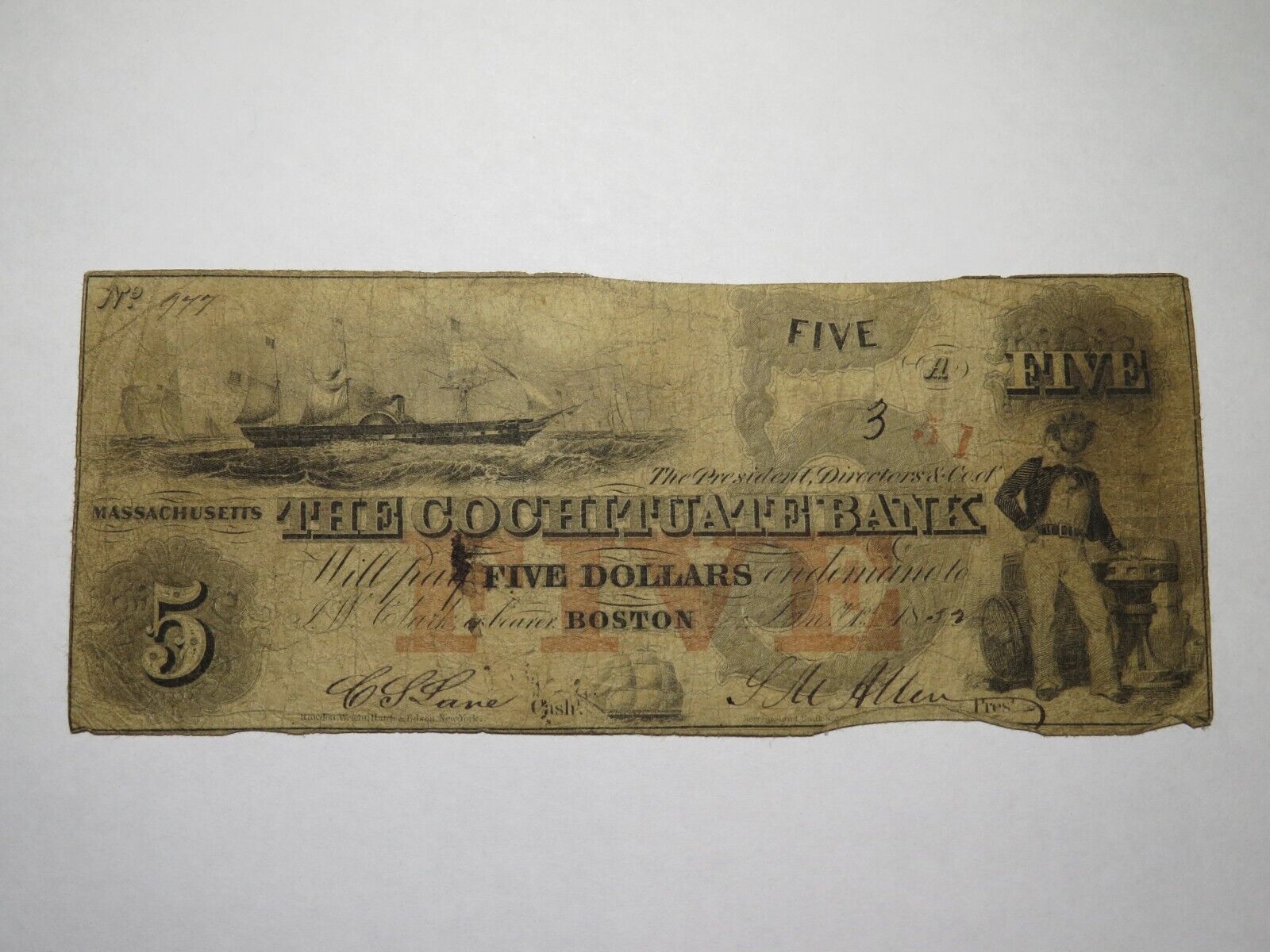 $5 1852 Boston Massachusetts Obsolete Bank Note