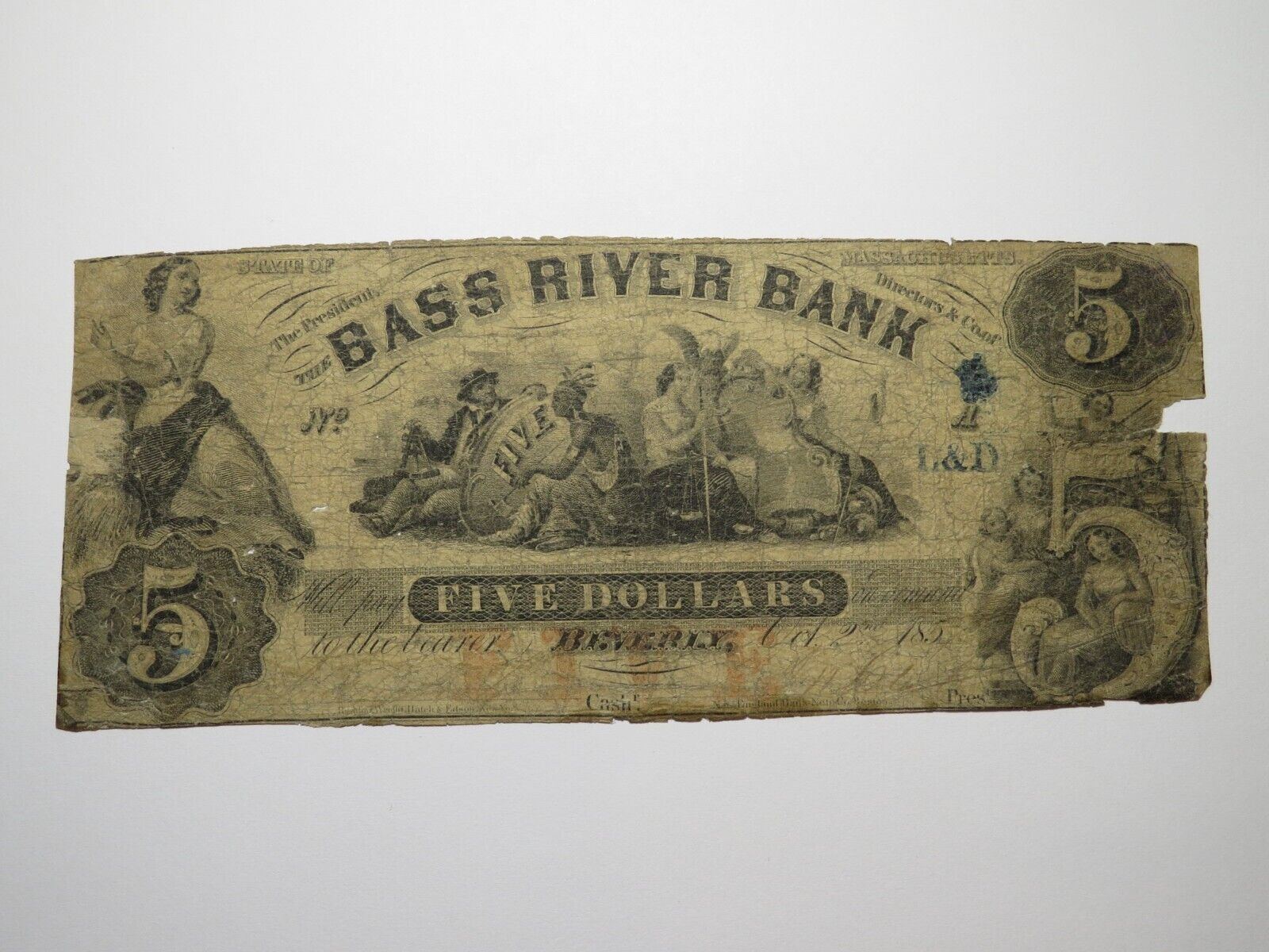 $5 1857 Beverly Massachusetts Obsolete Currency Bank Note Bill Bass River Bank