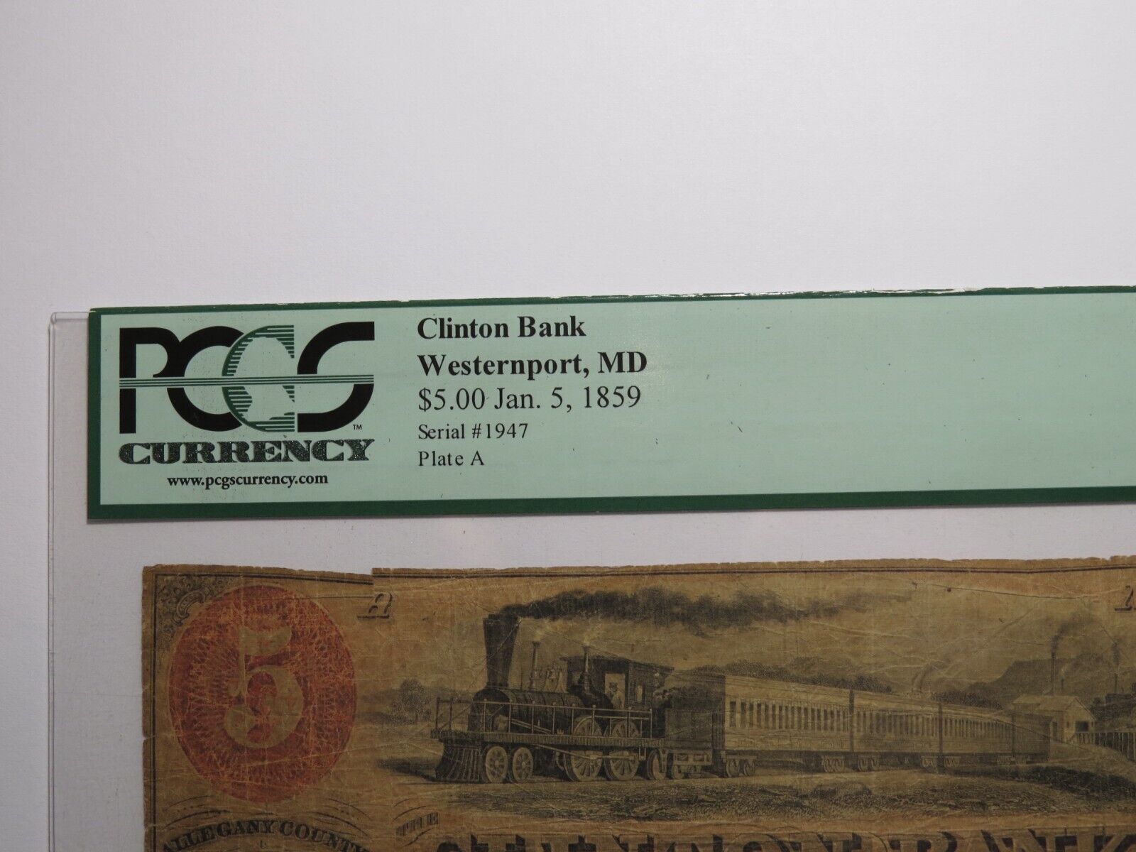 Up for auction is a $5 1859 Westernport Maryland Obsolete Bank Note. This note is dated January 5, 1859. This note was issued by The Clinton Bank. This note has been graded Fine 12 Apparent by PCGS. This is a tough to find issue. This bill is a must have for any collector of Obsolete Currency!