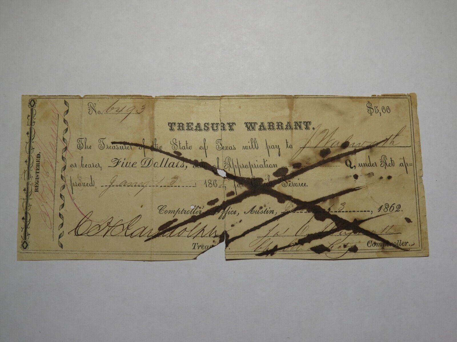 Up for auction is a $5 1862 Austin Texas Treasury Warrant. This warrant was issued by the State of Texas. This note is dated January 3, 1862. This bill is a must have for any collector of Obsolete Currency!