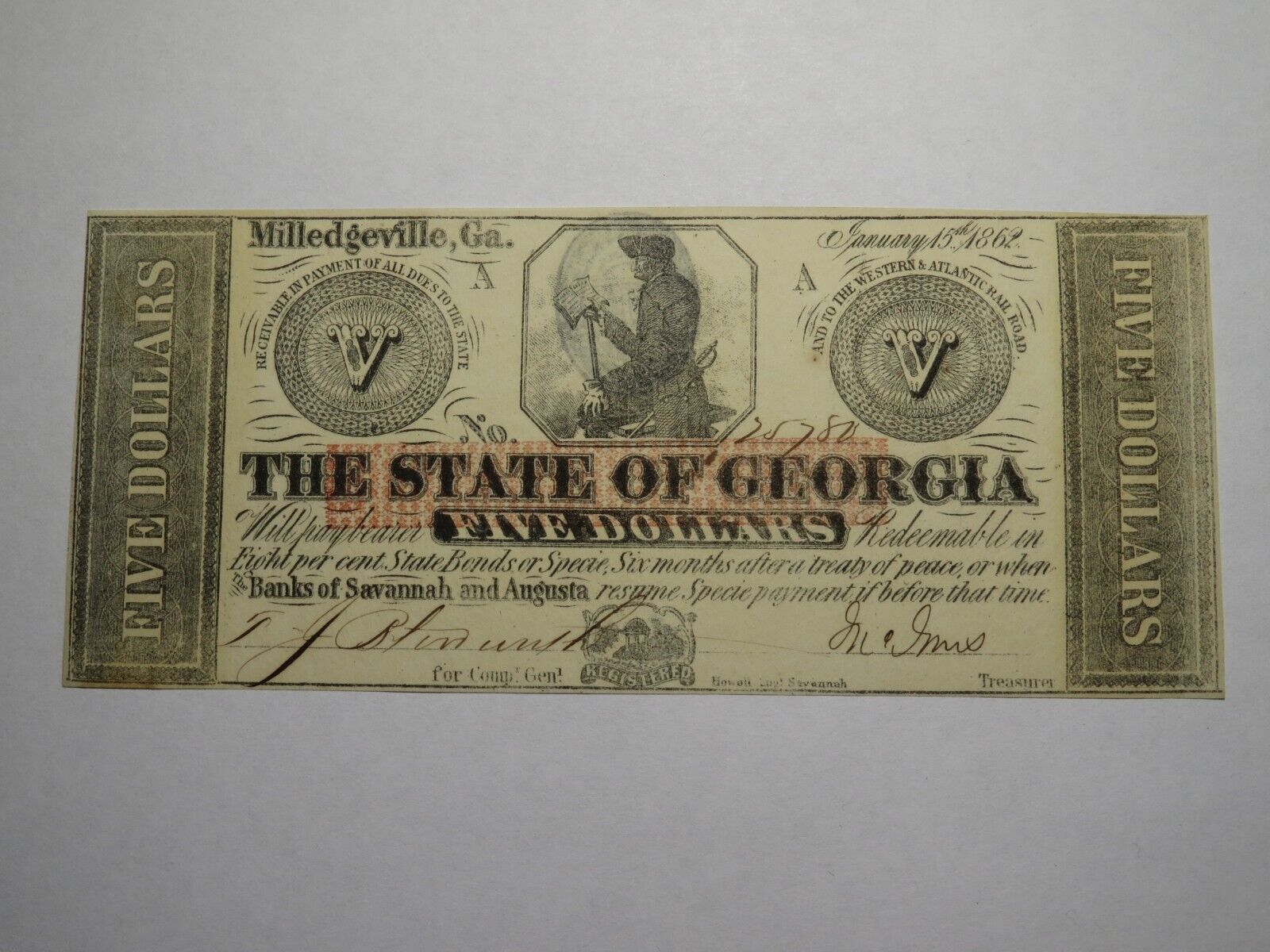 Up for auction is a $5 1862 Milledgeville Georgia Obsolete Bank Note. This note is dated January 15, 1862. This bill was issued by the State of Georgia. This is a great rare bill from a popular Georgia town. This bill is a must have for any collector of Obsolete Currency. If you have any questions please feel free to ask!