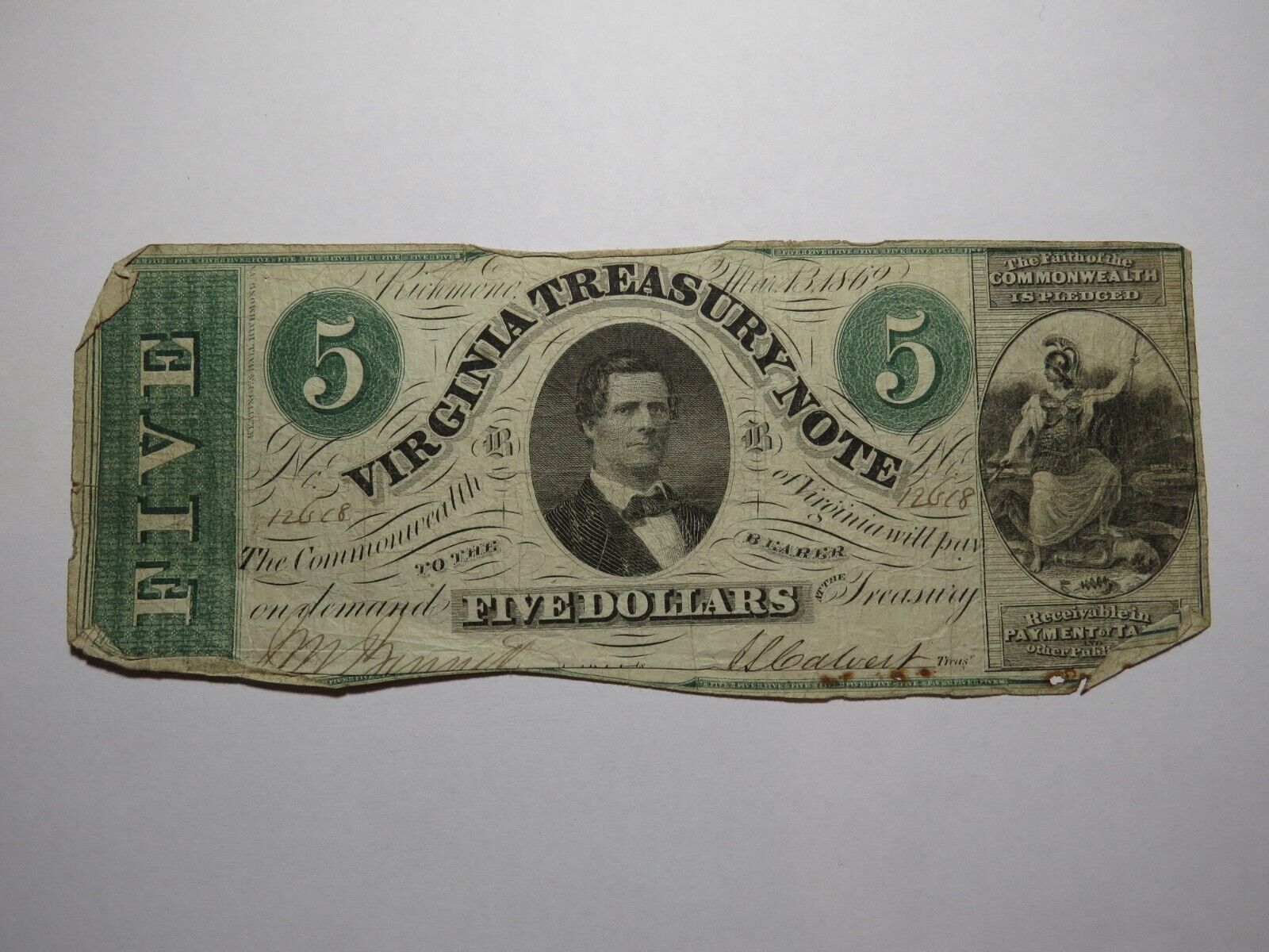 $5 1862 Richmond Virginia VA Obsolete Currency Treasury Bank Note Bill