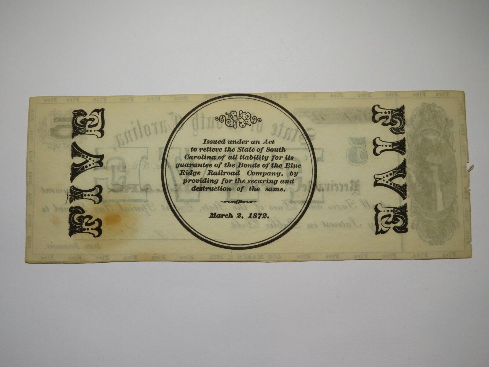 Up for auction is a $5 1872 Columbia South Carolina Obsolete Bank Note. This note is dated March 2, 1872. This note was issued by The State of South Carolina. This bill is a must have for any collector of Obsolete Currency. If you have any questions please feel free to ask!