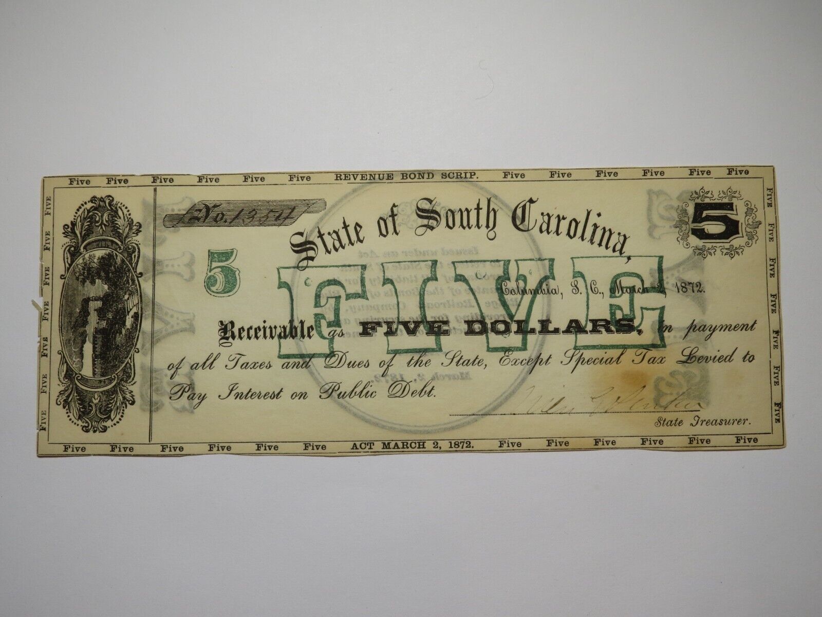 $5 1872 Columbia South Carolina Obsolete Bank Note!