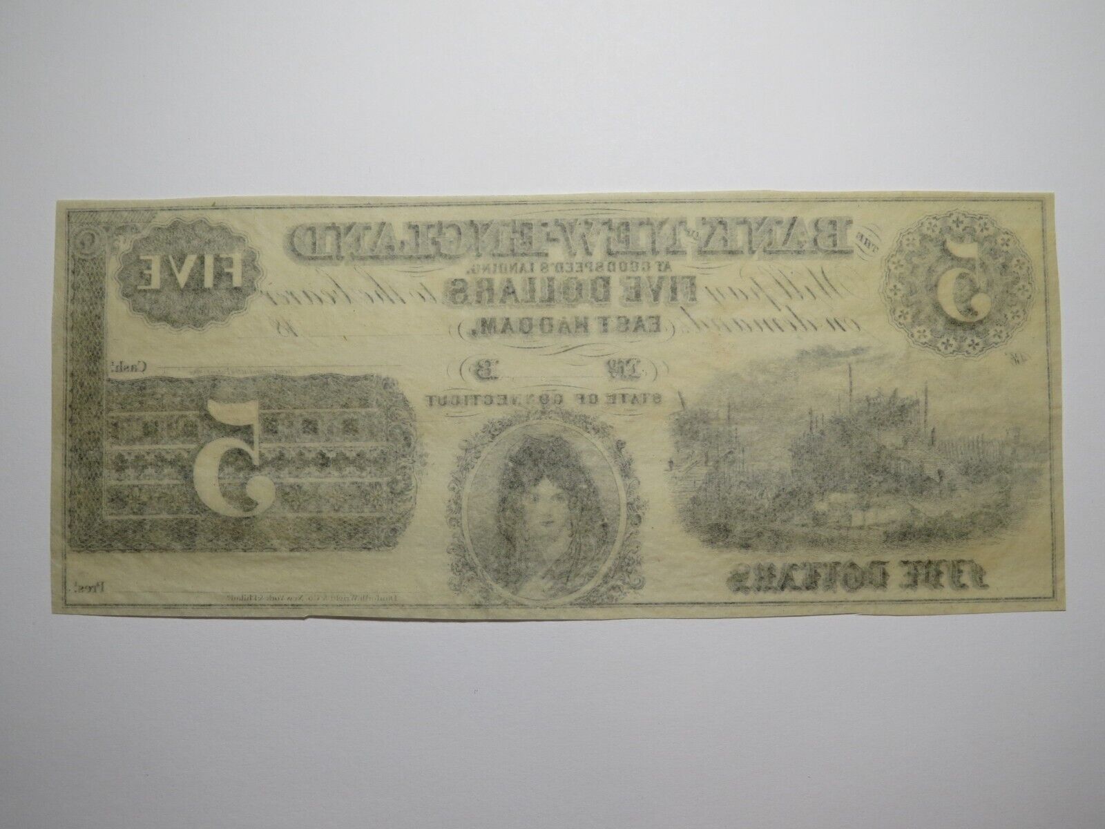 Up for auction is a $5 18__ East Haddam Connecticut Obsolete Remainder Bank Note. This note was issued by The Bank of New England At Goodspeed's Landing. This note is in Crisp Uncirculated condition. This note is extremely rare, and it is getting much harder to find this type of bill! This bill is a must have for any collector of Obsolete Currency. If you have any questions please feel free to ask.