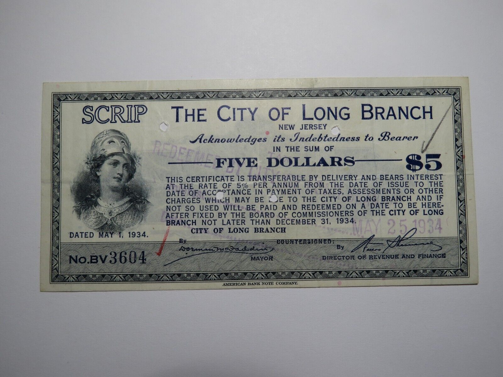 $5 1934 Long Branch New Jersey Obsolete Currency Scrip!