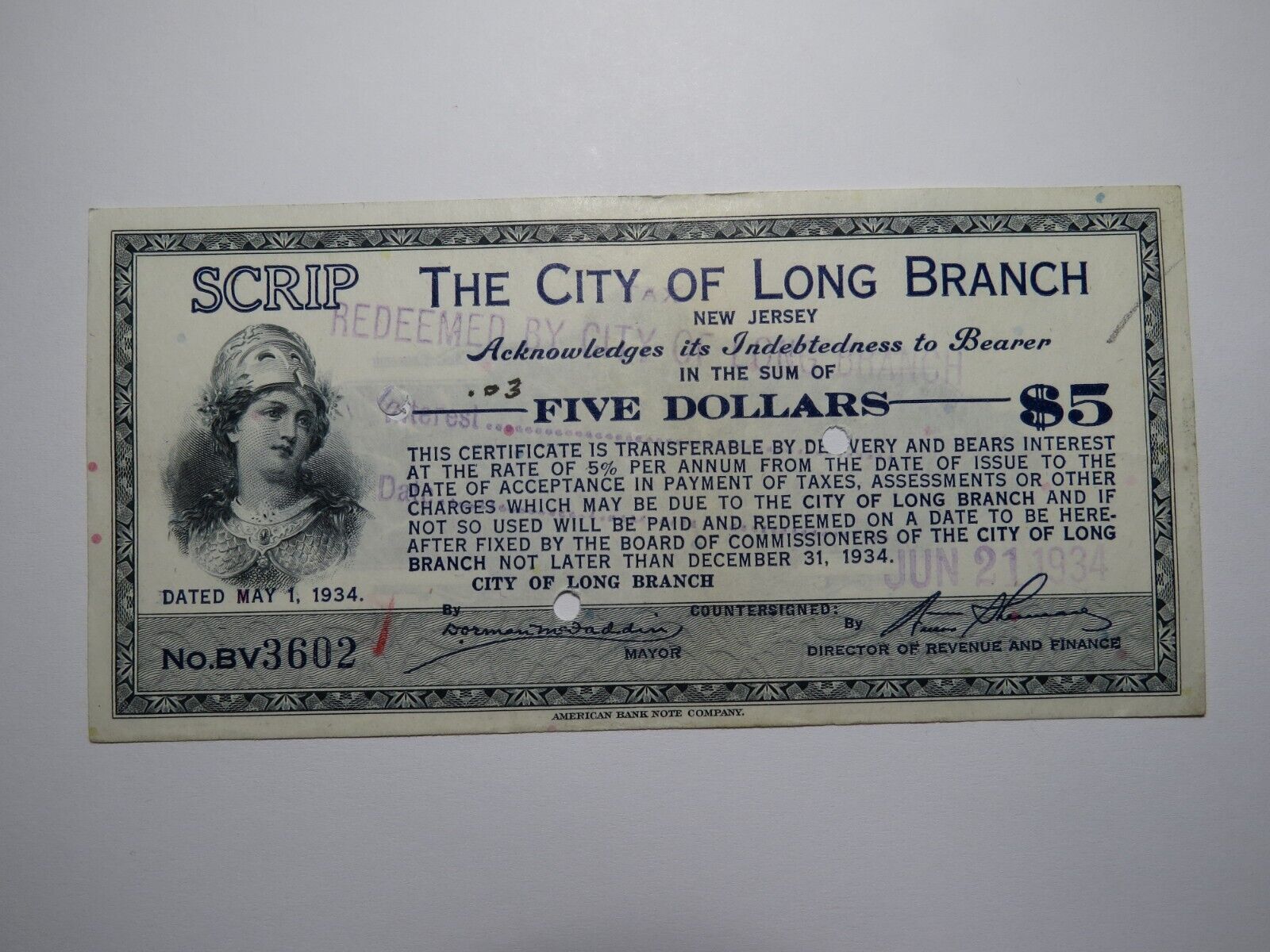 $5 1934 Long Branch New Jersey Obsolete Currency Scrip!