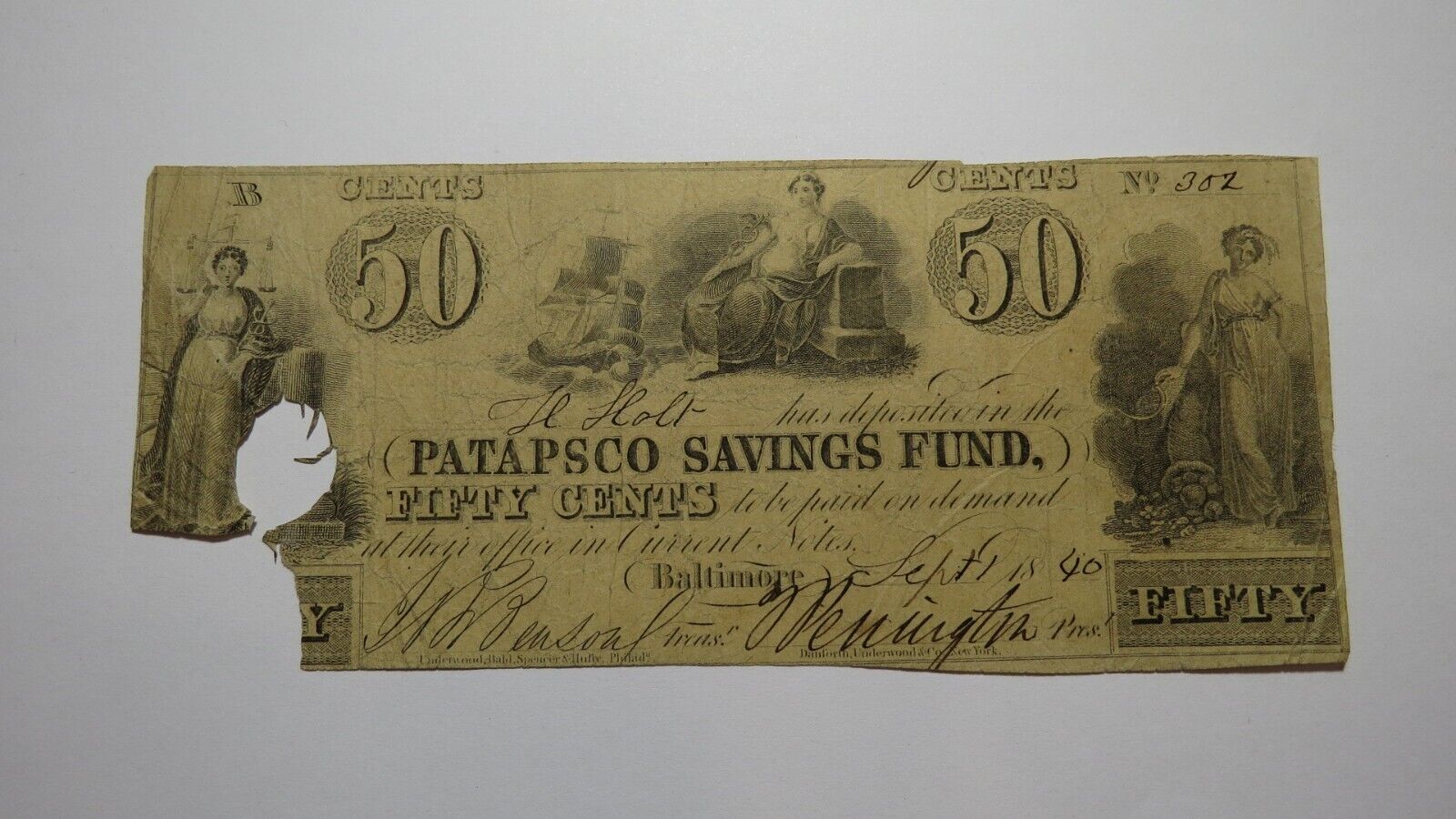 Up for auction is a $.50 1840 Baltimore Maryland Obsolete Bank Note. This note is dated September 1, 1840. This bill was issued from The Patapsco Savings Fund. This is a tough to find issue! This bill is a must have for any collector of Obsolete Currency!