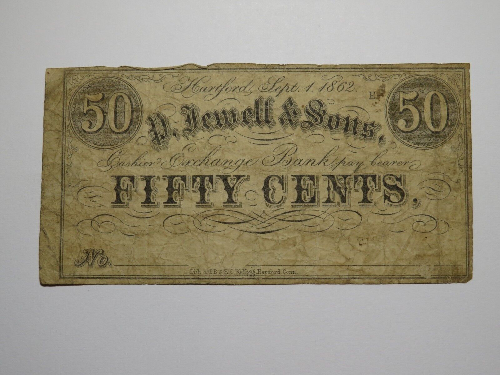 Up for auction is a $.50 1862 Hartford Connecticut Obsolete Bank Note. This note is dated September 1, 1862. This note was issued by P. Jewell & Sons. This is a tough to find issue! This bill is a must have for any collector of Obsolete Currency. If you have any questions please feel free to ask!
