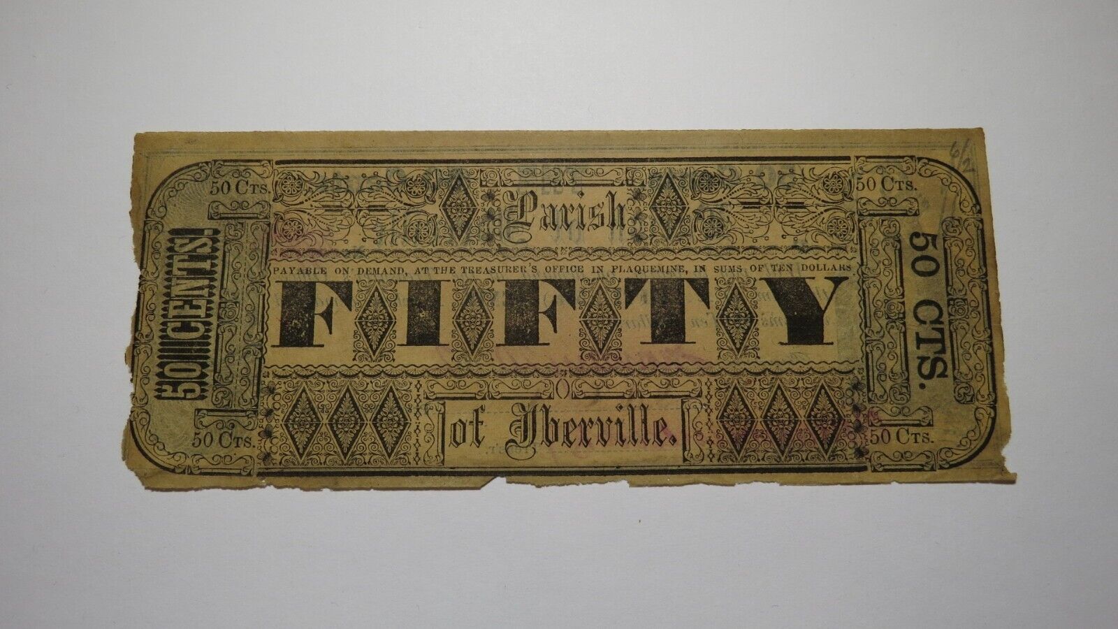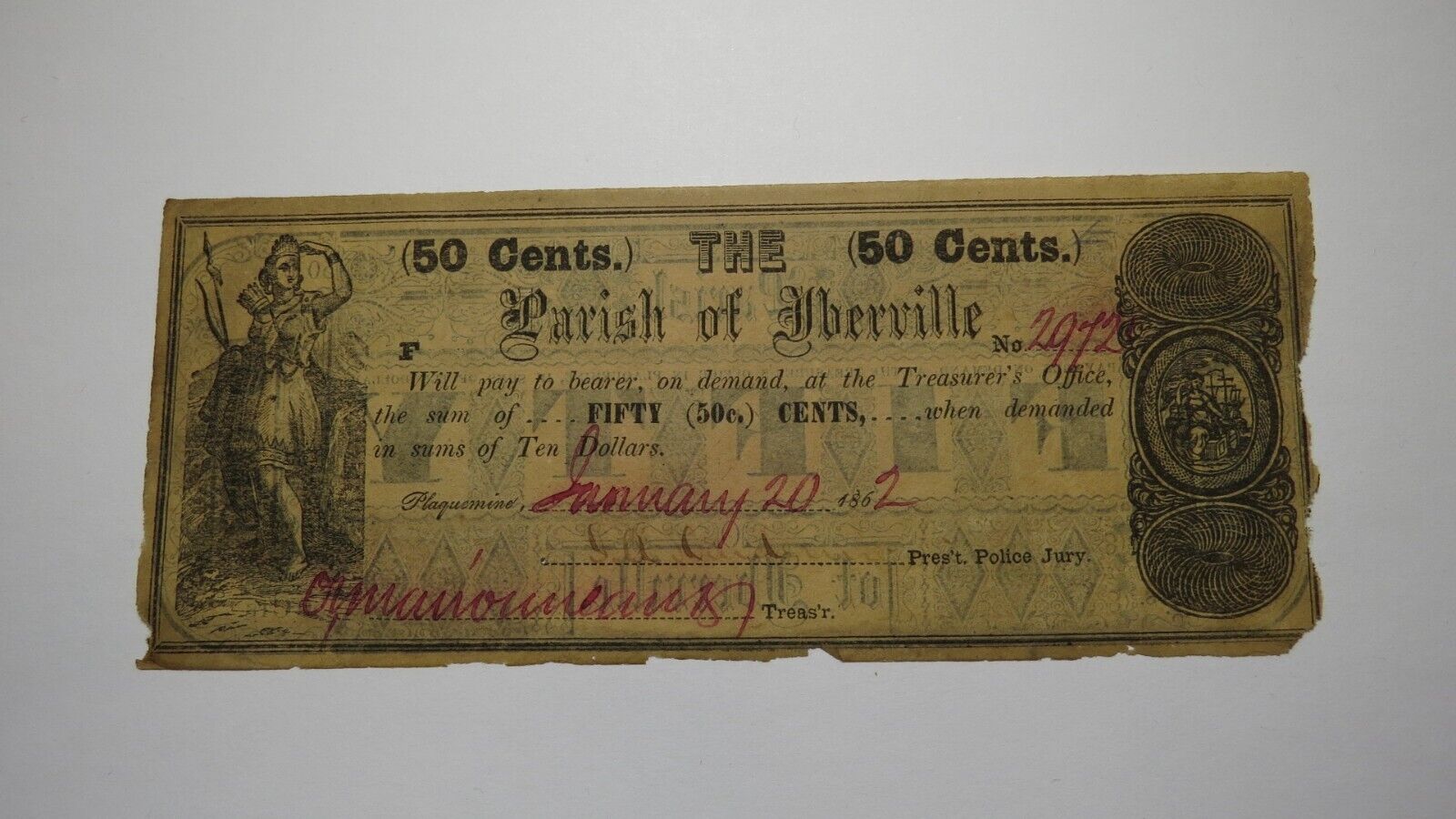 Up for auction is a $.50 1862 Plaquemine Louisiana Obsolete Bank Note. This note is dated January 20, 1862. It was issued from The Parish of Iberville. This is a tough to find issue. This bill is a must have for any collector of Obsolete Currency!