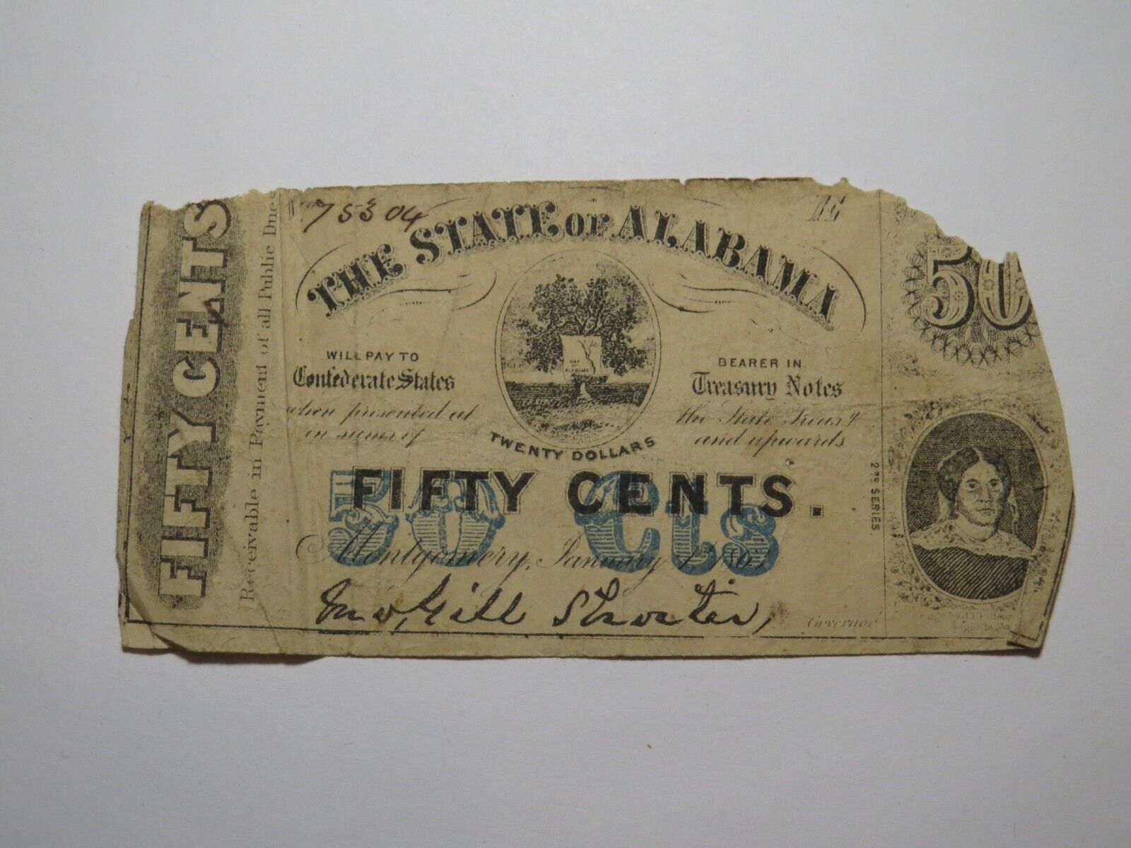 Up for auction is a $.50 1863 Montgomery Alabama Obsolete Bank Note. This note is dated January 1, 1863. This note was issued by The State of Alabama. This bill is a must have for any collector of Obsolete Currency. If you have any questions please feel free to ask!