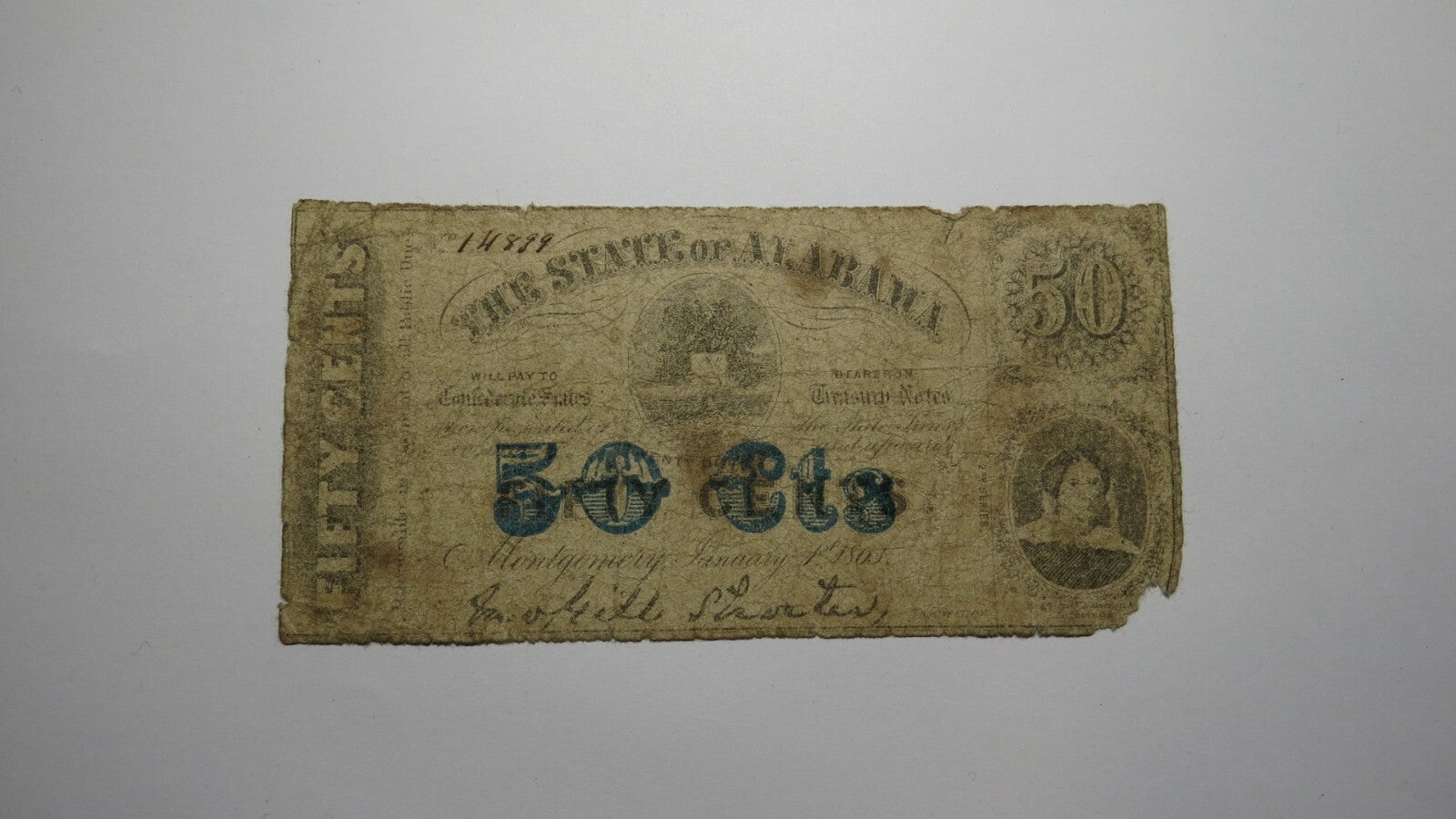 Up for auction is a $.50 1863 Montgomery Alabama Obsolete Bank Note. This note is dated January 1, 1863. It is issued from The State of Alabama. This note is extremely rare, and it is getting much harder to find this type of bill! This bill is a must have for any collector of Obsolete Currency!