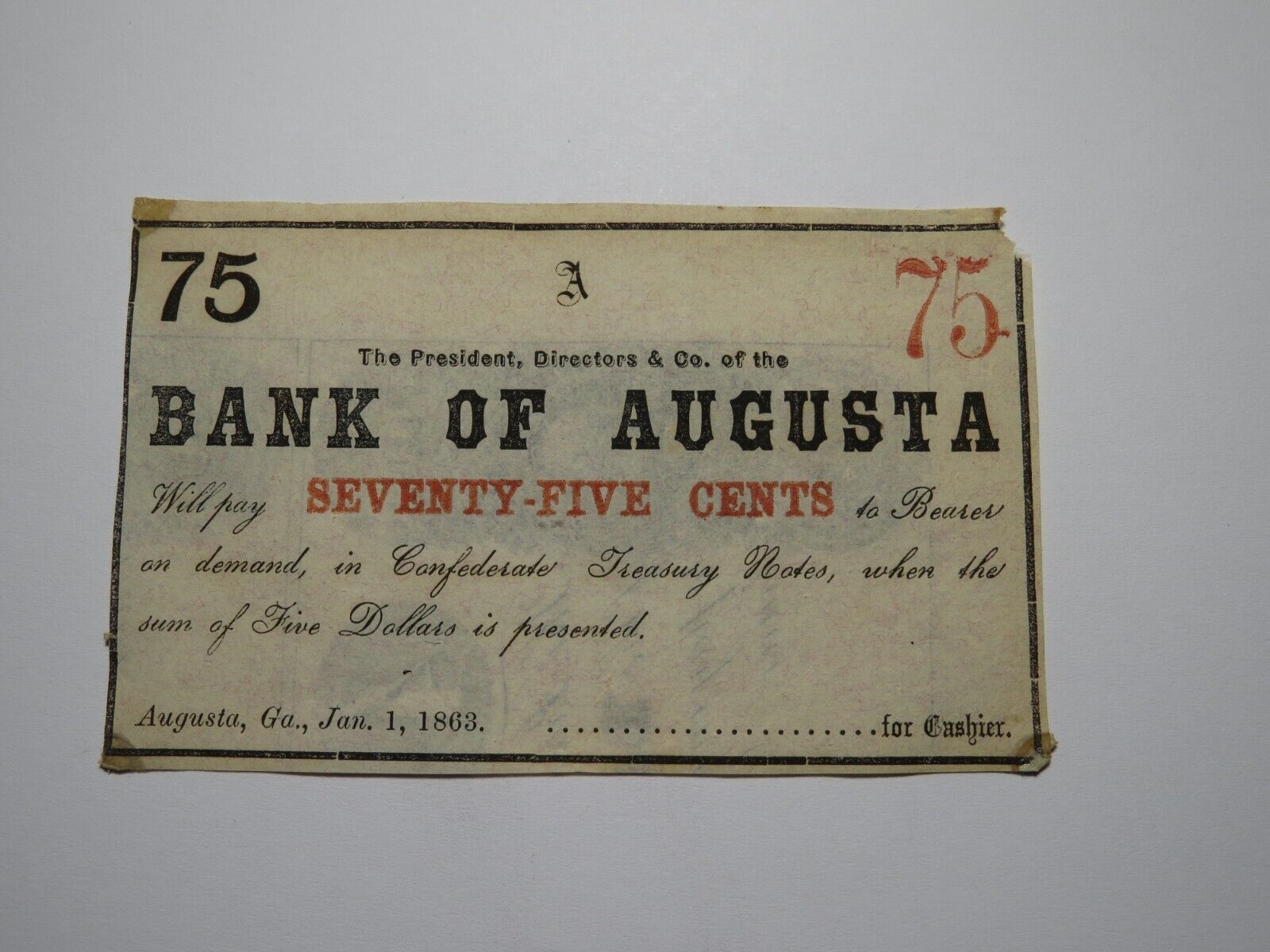 $.75 1863 Augusta Georgia Obsolete Bank Note!