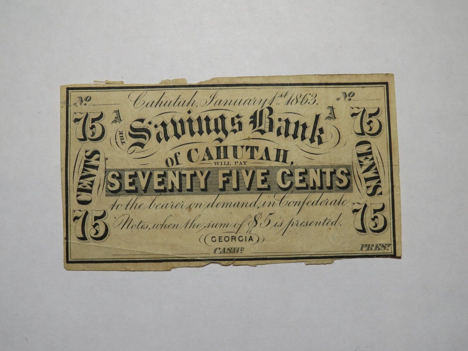 $.75 1863 Cahutah Georgia Obsolete Bank Note!