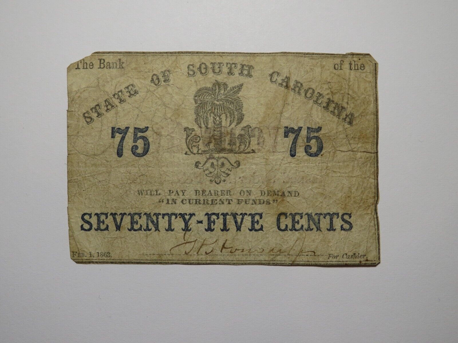 $.75 1863 Charleston South Carolina Obsolete Currency Bank Note State of SC