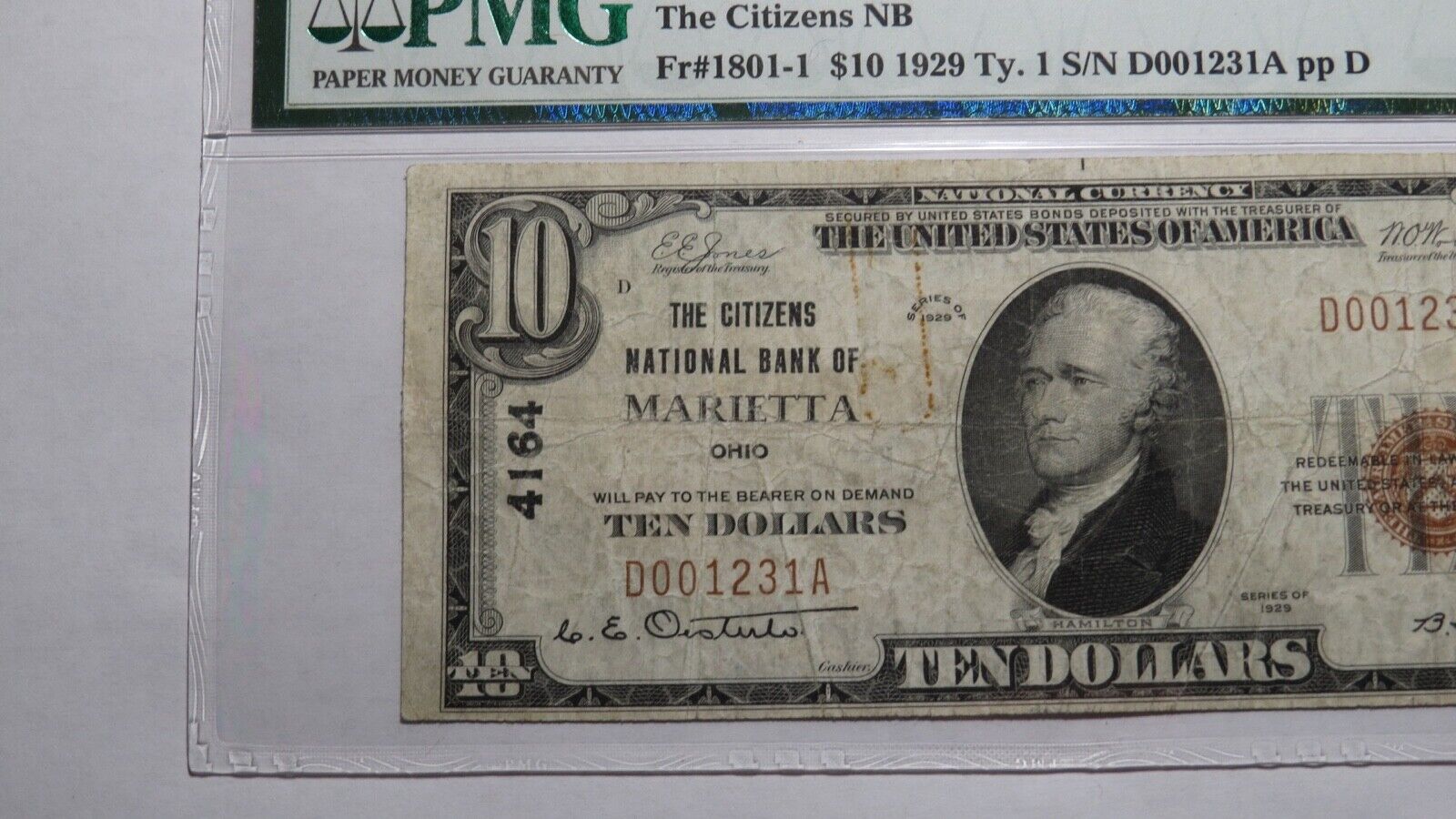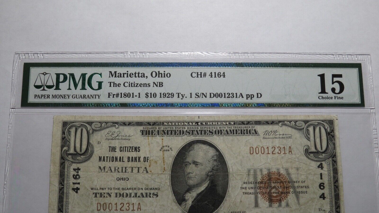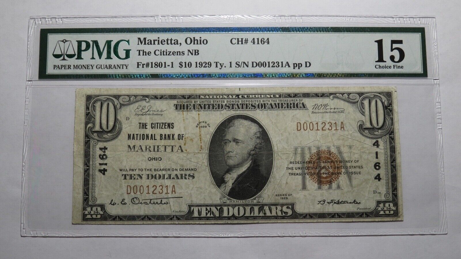 Up for auction is a $10 1929 Marietta Ohio Type 1 National Currency Note. It is issued from The Citizens National Bank of Marietta. It is Charter #4164. Marietta is an always in demand Ohio town! This bill has been graded Choice Fine 15 by PMG. It is noted that there is some minor rust on the note. This bill is a must have for any collector of National Currency!