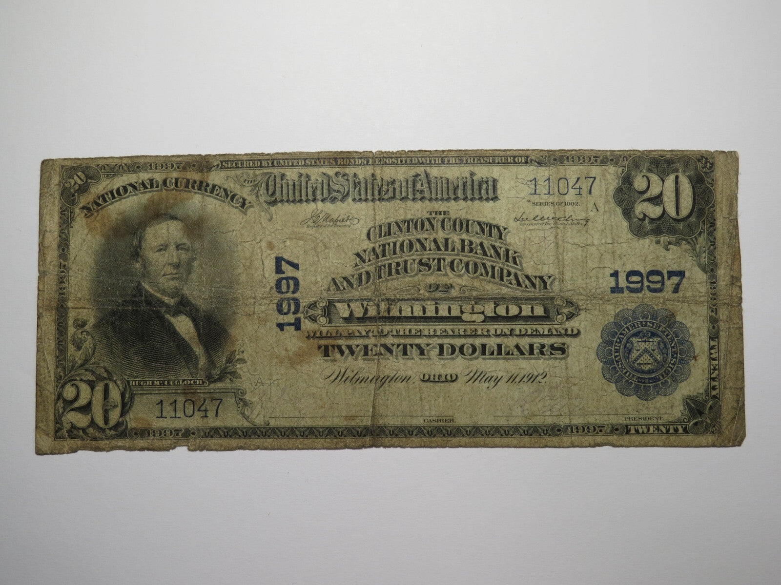 Up for auction is a $20 1902 Wilmington Ohio Plain Back National Currency Note.  This note was issued by The Clinton County National Bank and Trust Company of Wilmington.  It is Charter #1997.  Wilmington is an always in demand Ohio town!  This note has some crisp left to it and is in good shape but well circulated condition.  This bill is a must have for any collector of National Currency!