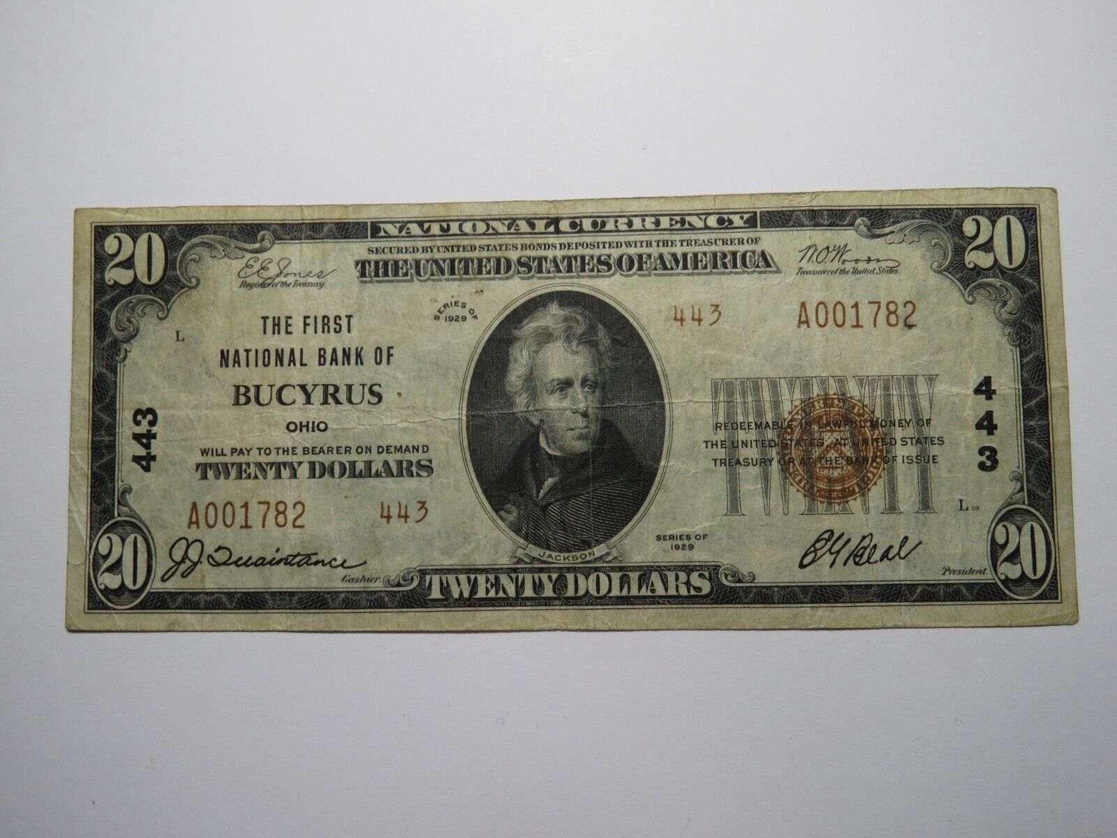 Up for auction is a $20 1929 Bucyrus Ohio Type 2 National Currency Note. This note was issued by The First National Bank of Bucyrus. It is Charter #443. Bucyrus is an always in demand Ohio town! This note still has some good crisp left to it and is in good shape with no issues. This is a great looking bill that is a must have for any collector of National Bank Notes!