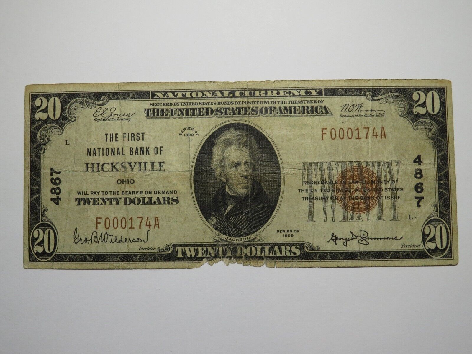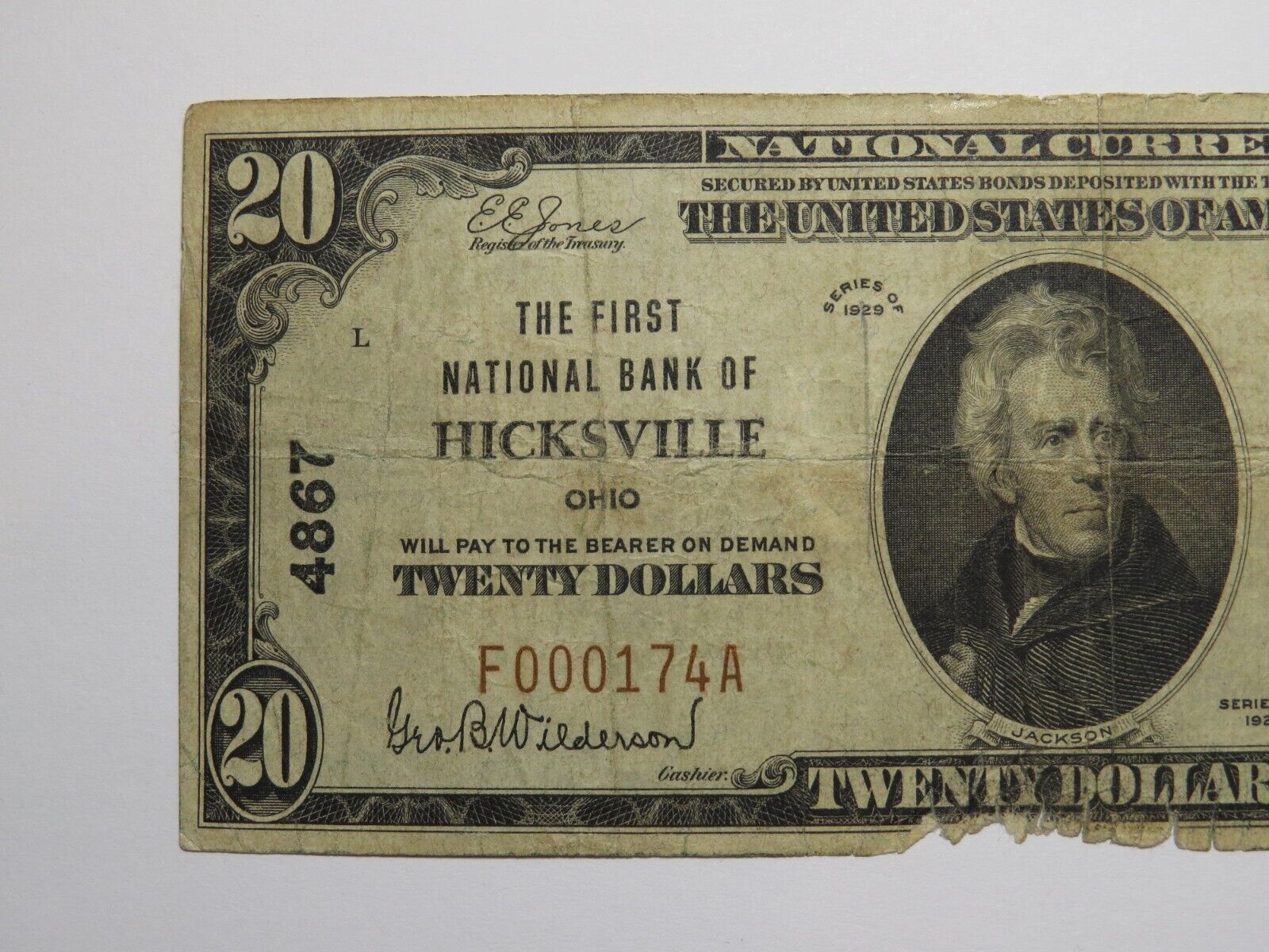 Up for auction is a $20 1929 Hicksville Ohio Type 1 National Currency Note. This note was issued by The First National Bank of Hicksville. It is Charter #4867. Hicksville is a tough to find Ohio town. This note still has some good crisp left to it and is in good overall shape but it does have a rough lower margin. This bill is a must have for any collector of National Currency!